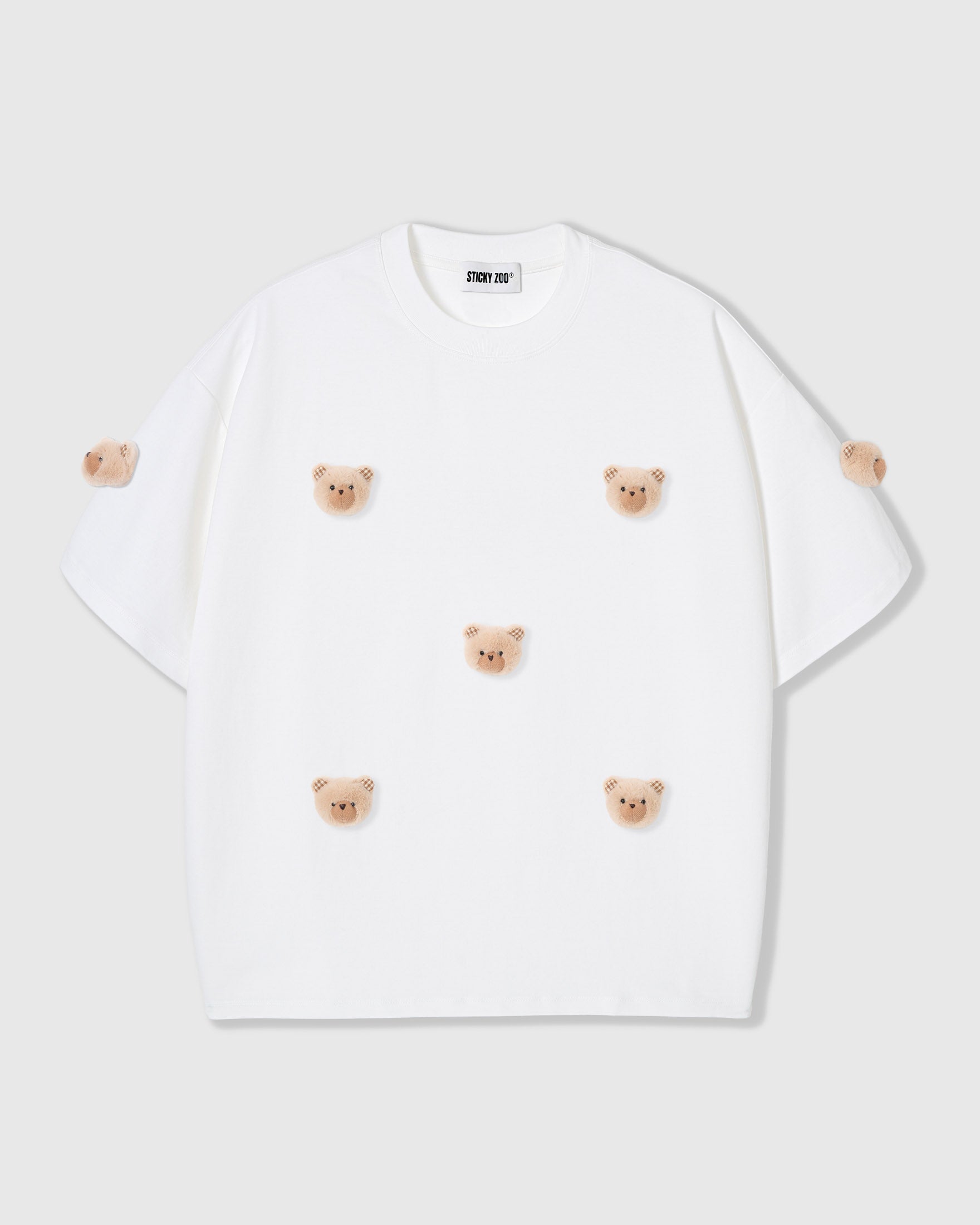 The Teddy Check-Ear Charm T-Shirt by Sticky-Zoo is crafted from premium 230gsm cool-touch cotton for breathable comfort and an elevated drape. Each plush bear head is stitched on by hand, so no two are exactly the same—tiny characters, quietly full of joy.