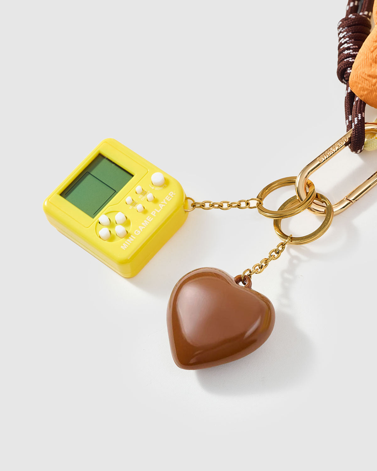 | Materials | Plush mascot; ABS mini game player; resin chocolate heart charm; braided paracord tassels (yellow & brown); 18K gold-plated hardware |