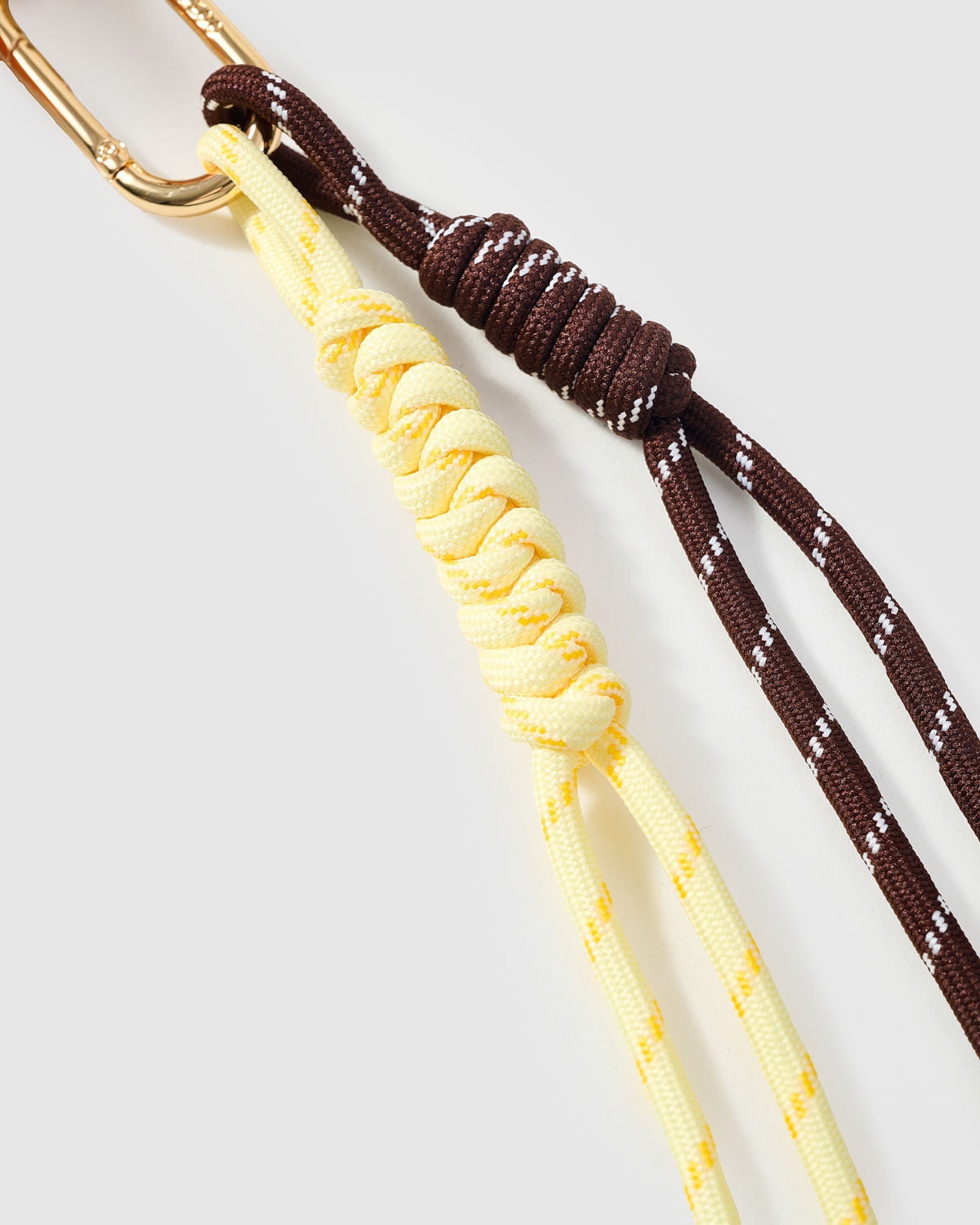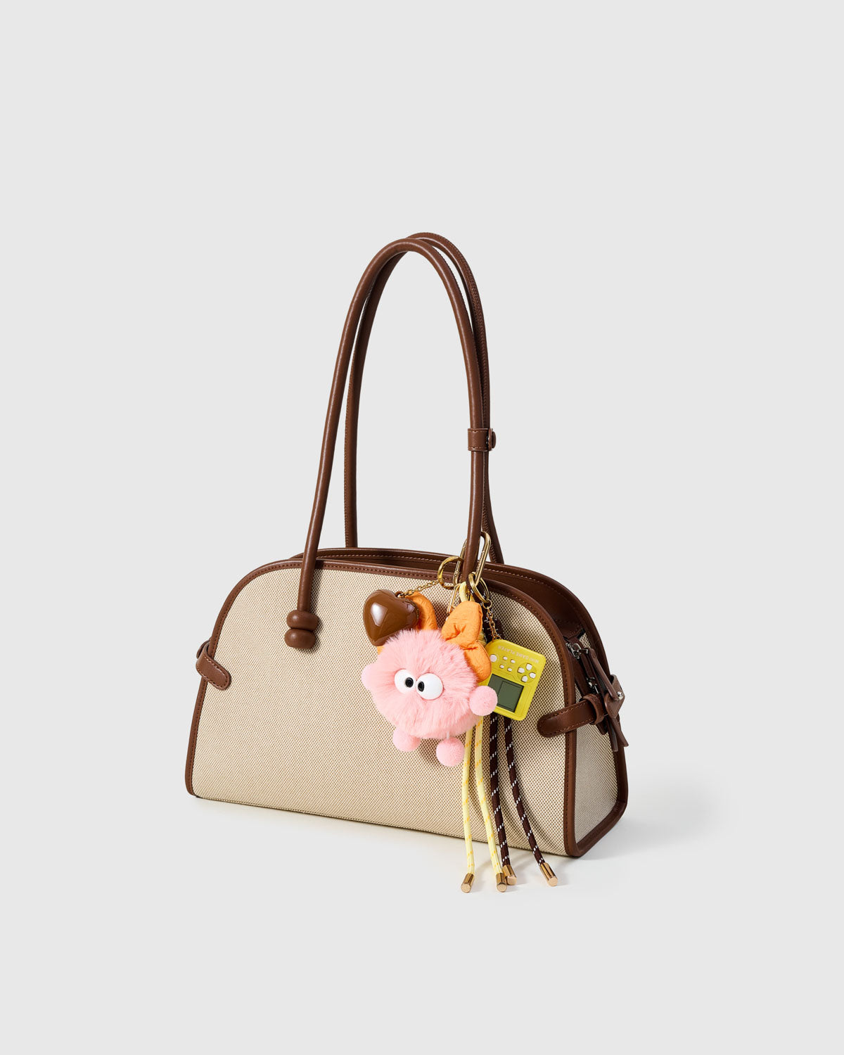 The CHERRY CHIP STACK CHARM – GAME HEART EDITION from Sticky Zoo® blends 2000s energy with soft charm craftsmanship. Hand-assembled with a pink plush mascot, a working yellow mini game, a glossy chocolate heart, and yellow/brown braided cords on 18K gold hardware, it layers effortlessly on handbags, keys, and totes.