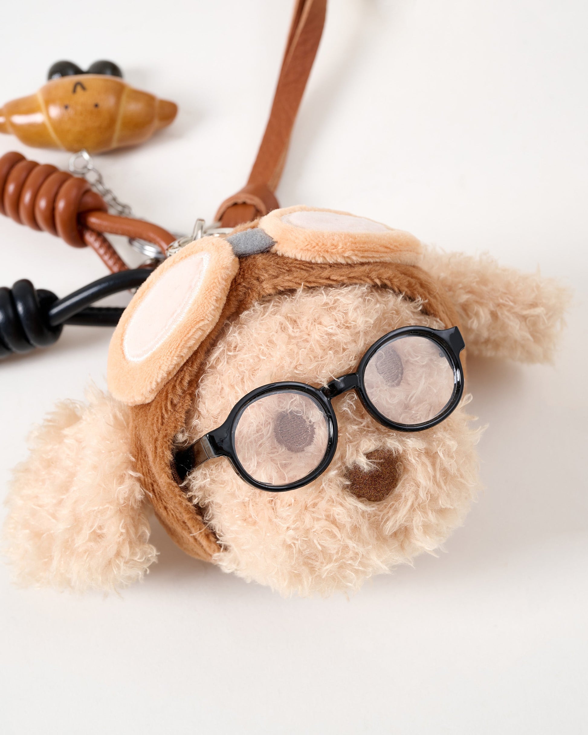 - Ultra-soft plush fur charm with vegan leather aviator cap and goggles