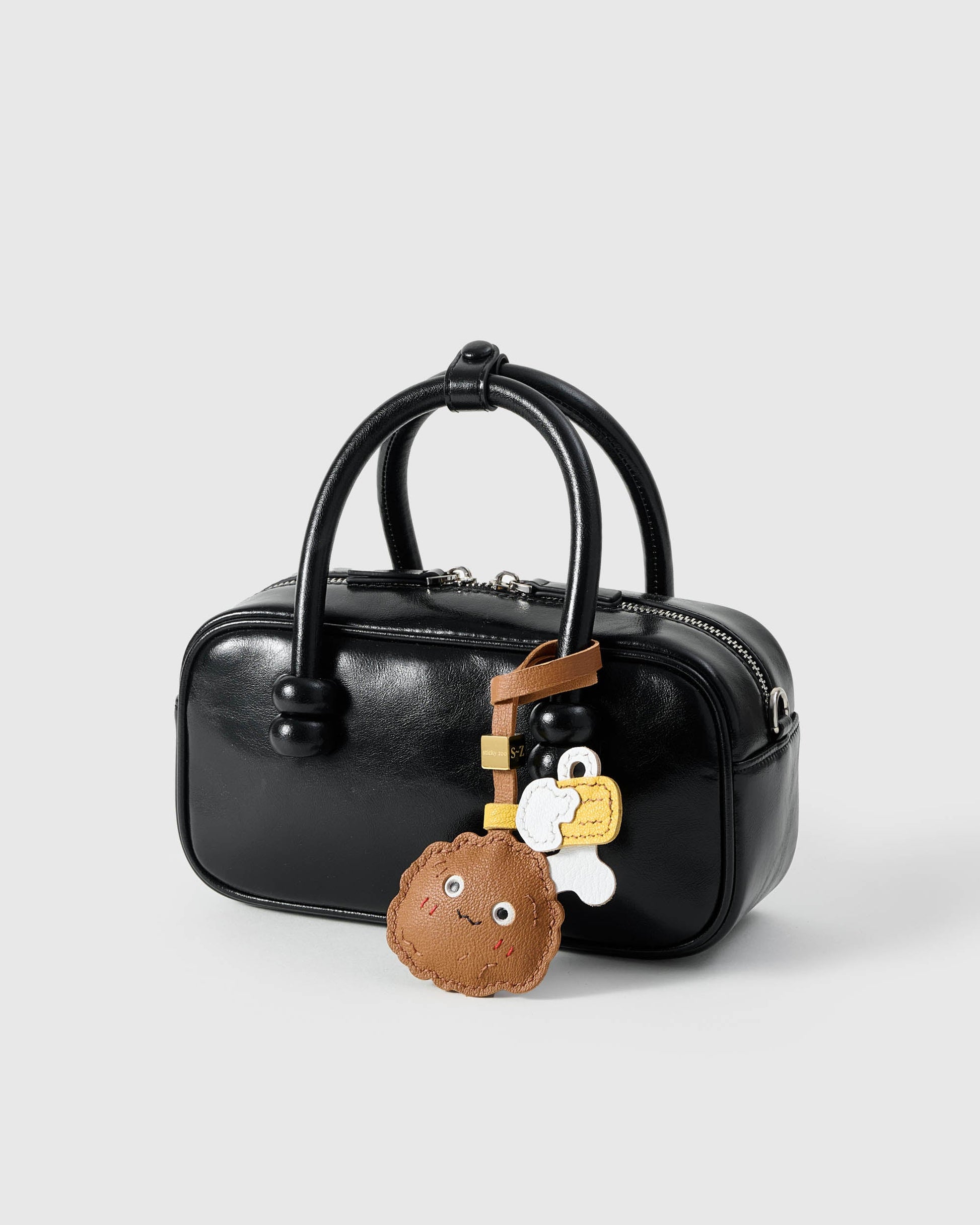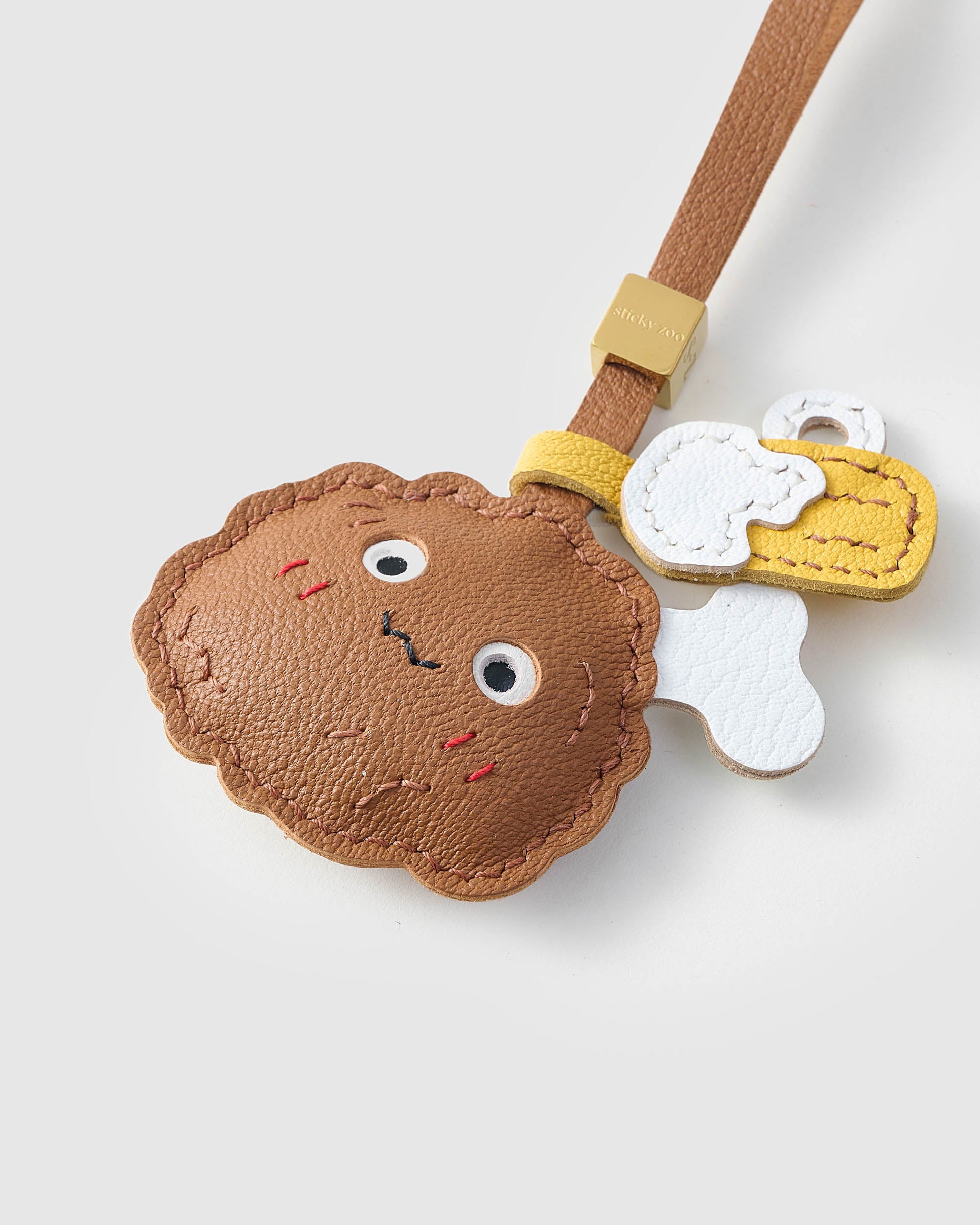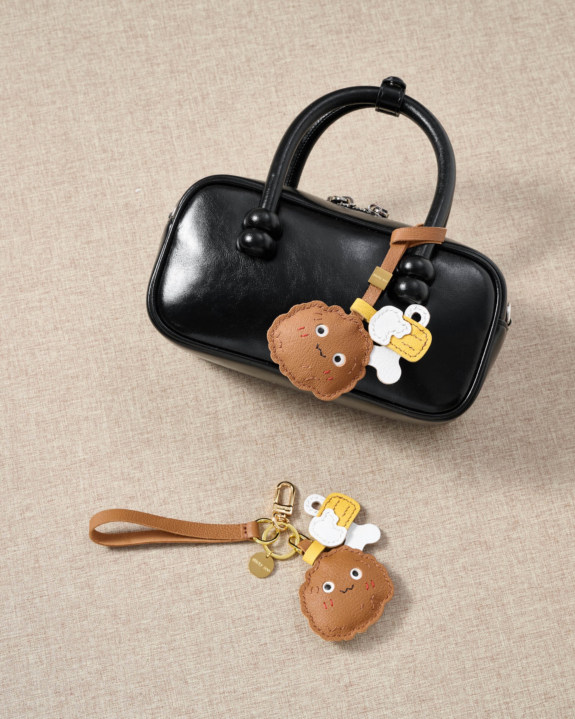 The CHICKEN WING SNACK ATTACK CHARM from STICKY ZOO® is sculpted in French Alran leather with a toasted-tan wing, stitched blush, and two swingy sidekicks: a tiny bone and a foamy root-beer mug. Clip it on and let the wobble do the flirting—picnic, party, or Monday commute.