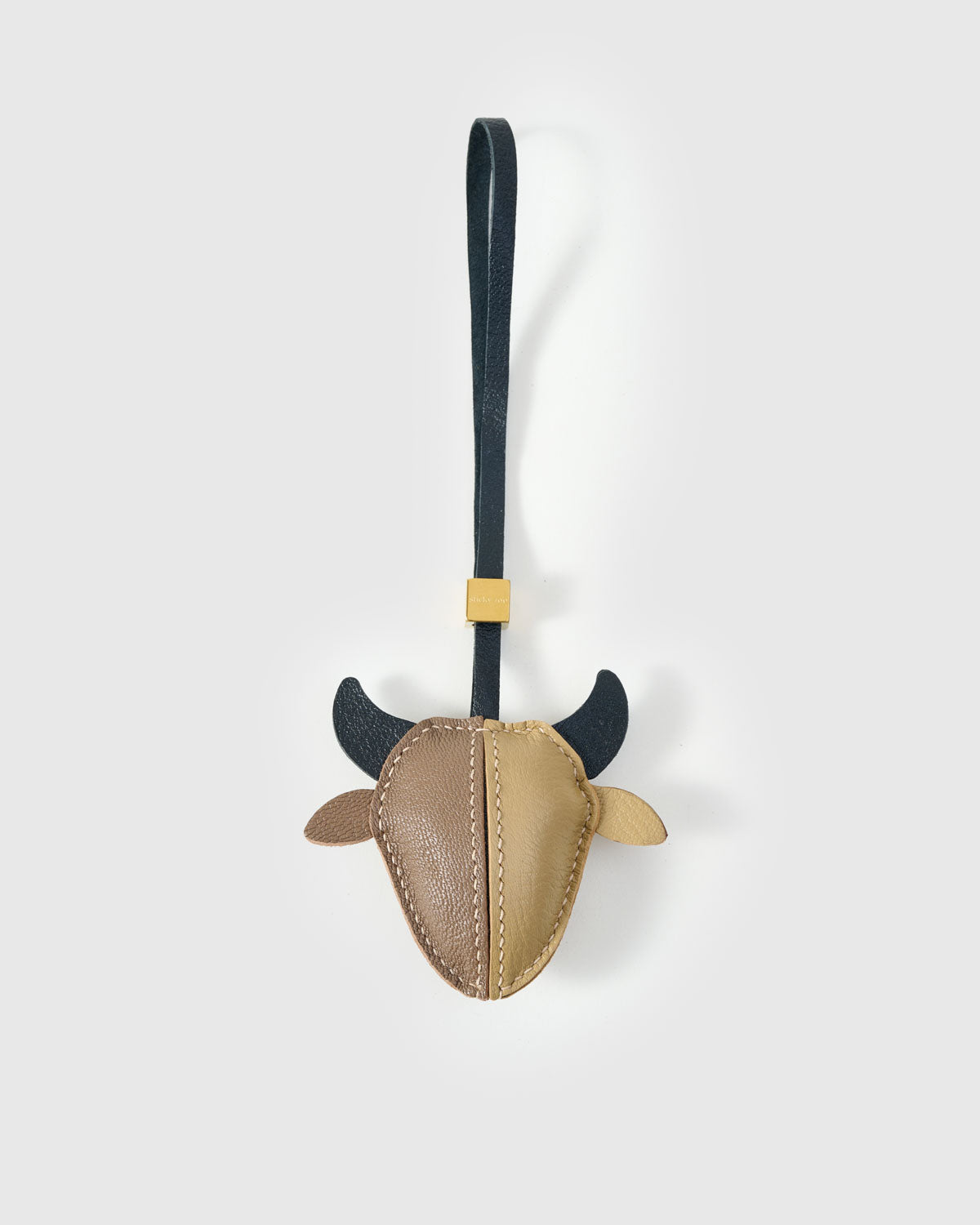 Each charm is carefully handmade from supple taupe and beige leather, creating a soft, sculpted look that feels both organic and luxurious. With its curved horns and delicate stitching, this design embodies warmth and quiet strength — a small piece of pastoral artistry to carry with you.