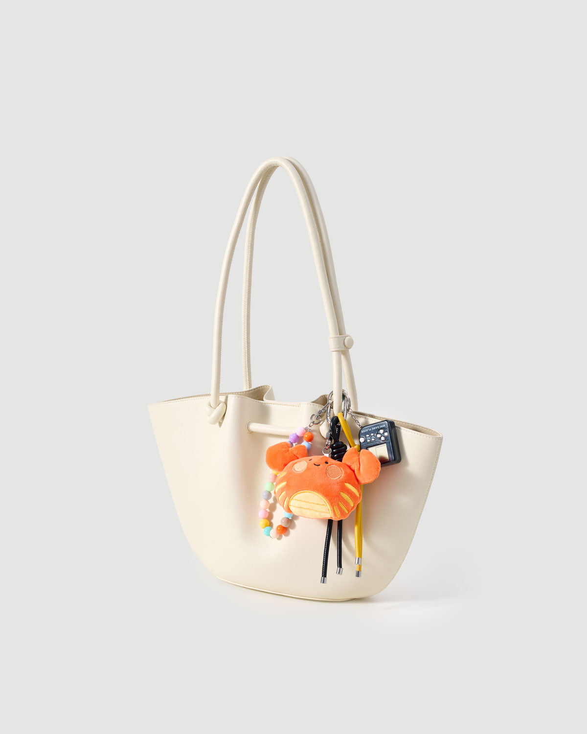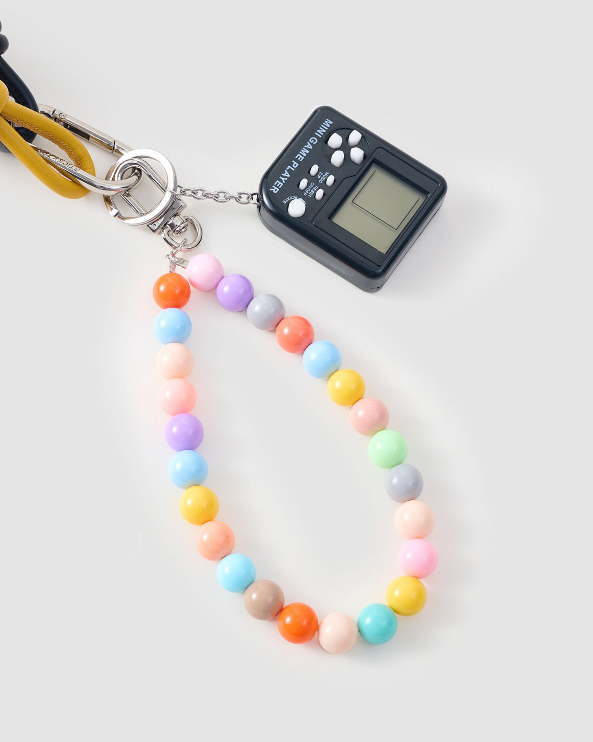 | Materials | Plush crab mascot; ABS mini game device; acrylic pastel bead loop; vegan-leather cords (mustard & black); stainless-steel hardware |