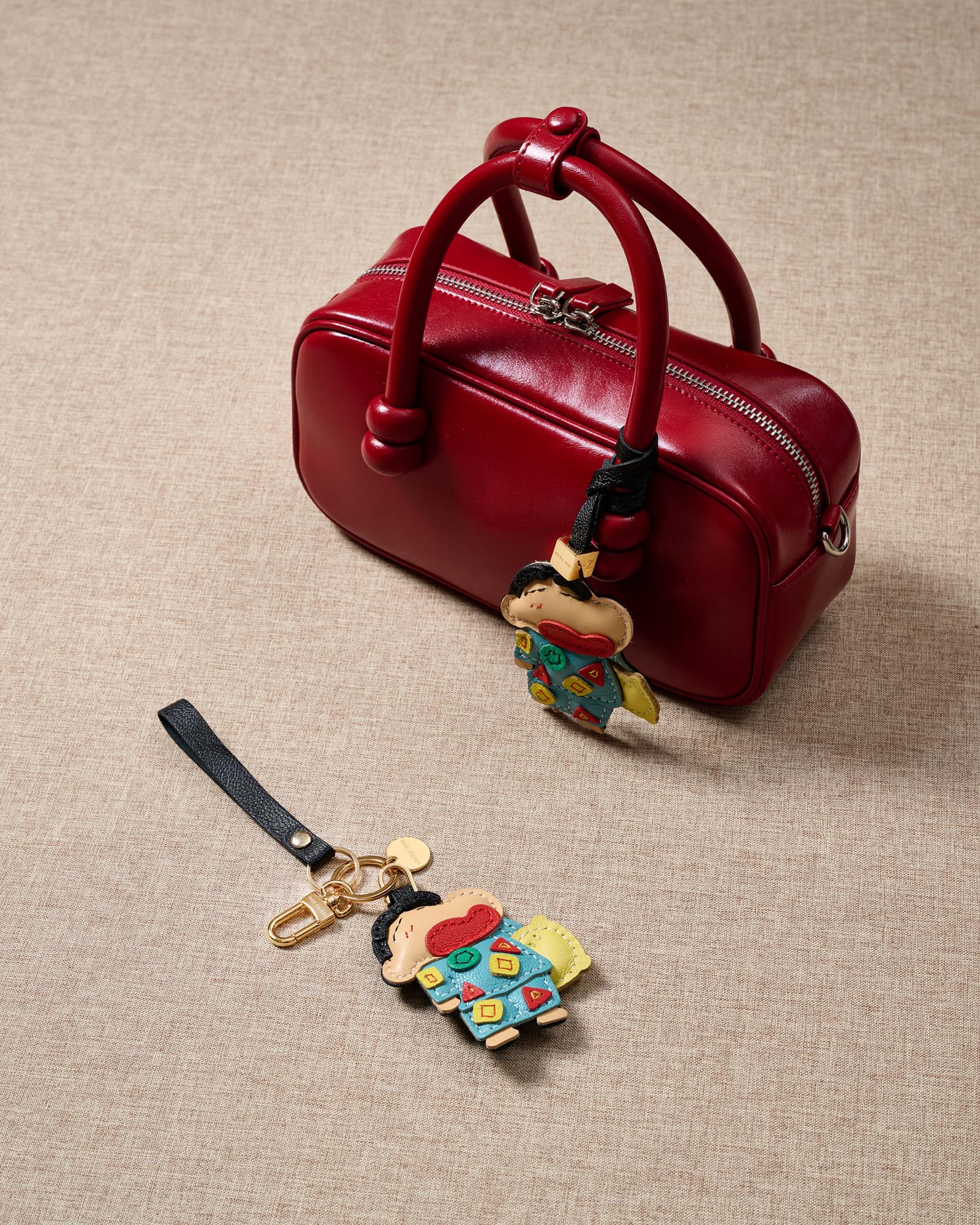 The charm vividly brings Shin-Chan’s mischievous personality to life in expertly stitched leather. Featuring his iconic expression, colorful turquoise pajama suit with geometric shapes, and even his bright yellow plush pillow. Every detail is hand-stitched meticulously by our Amsterdam artisans. Clip him onto your bag, keys, or let him swing from your backpack—after all, he's the boss.