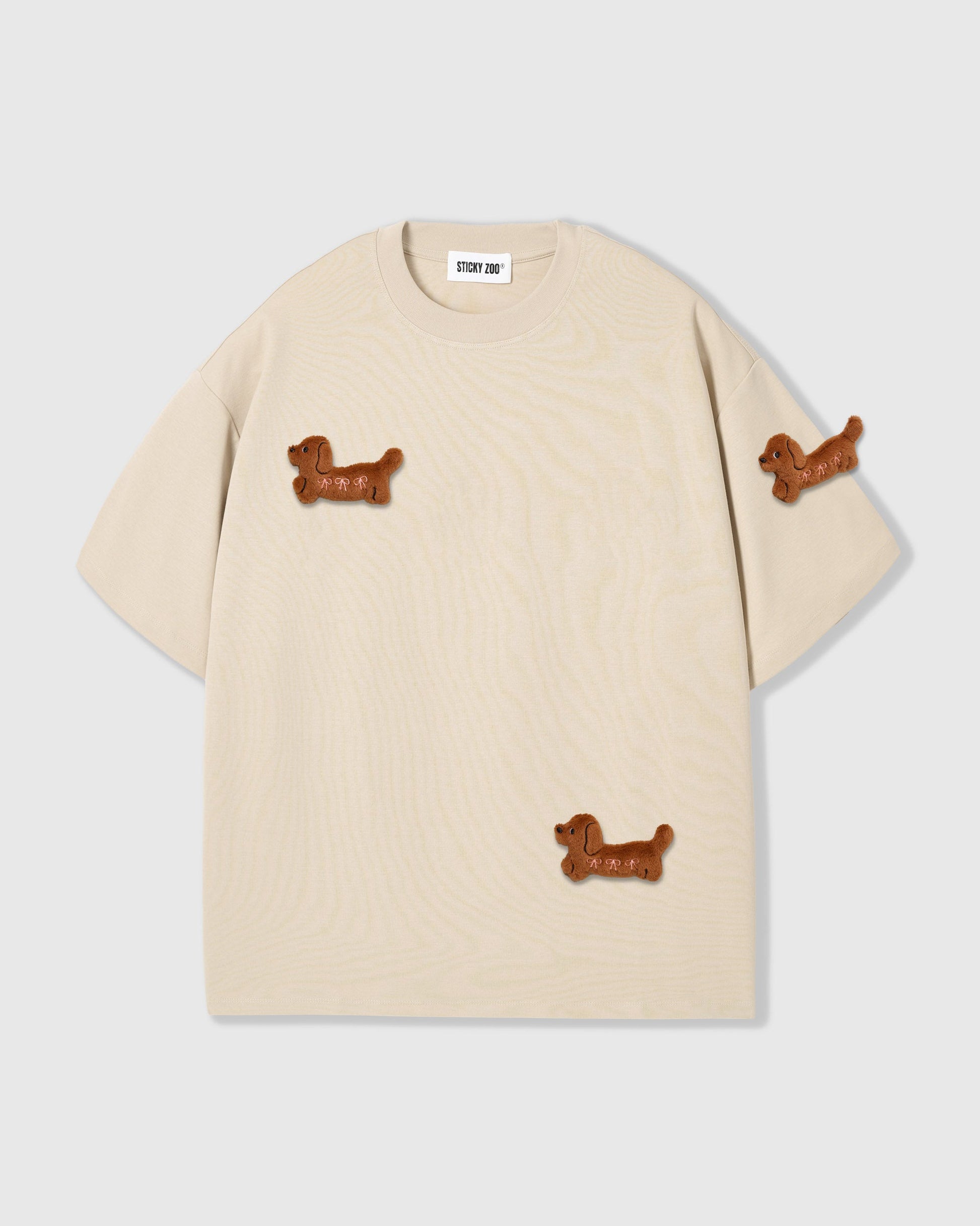 The Sticky Zoo® DASH DACHSHUND T-SHIRT is your daily warm fuzzy. Crafted in a lightweight 230gsm cotton, it keeps you feeling breezy while carrying three plush pups on your chest and sleeve. Handmade and hand-stitched, this is streetwear with soft energy—perfect for people who wear their heart on their shirt (and their dogs too).