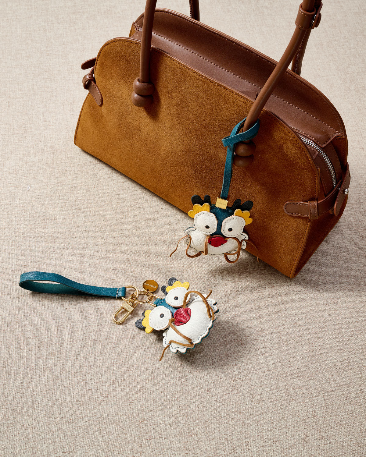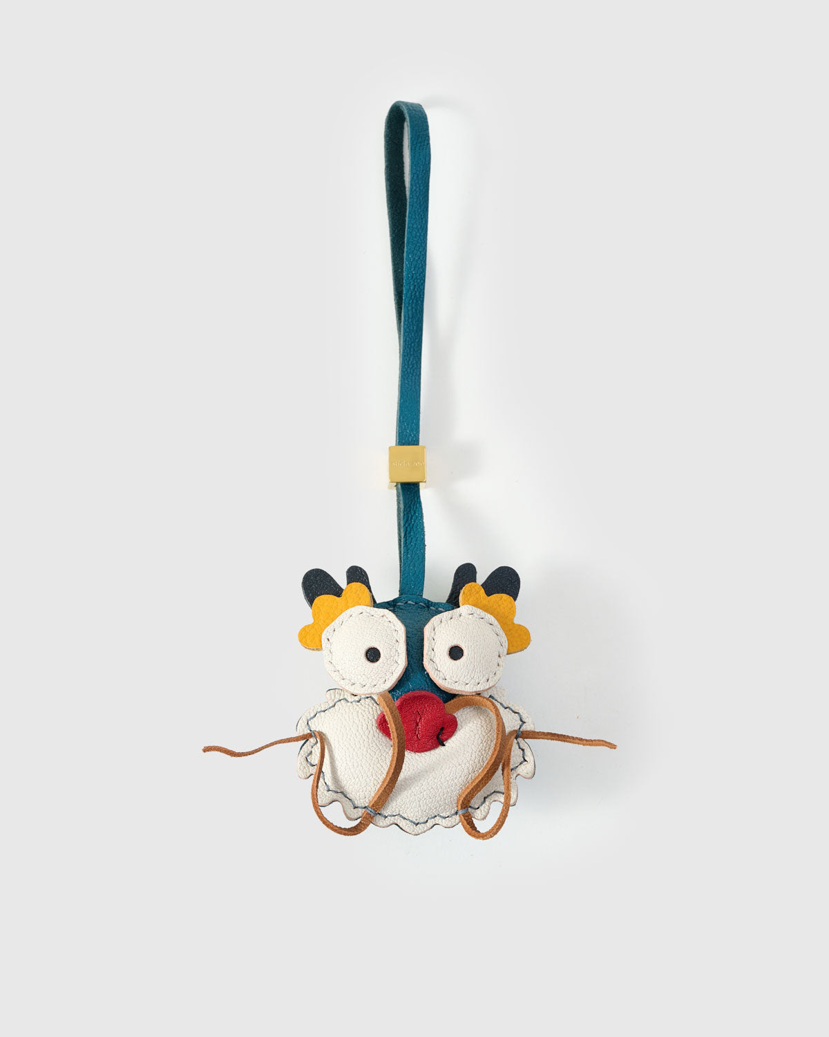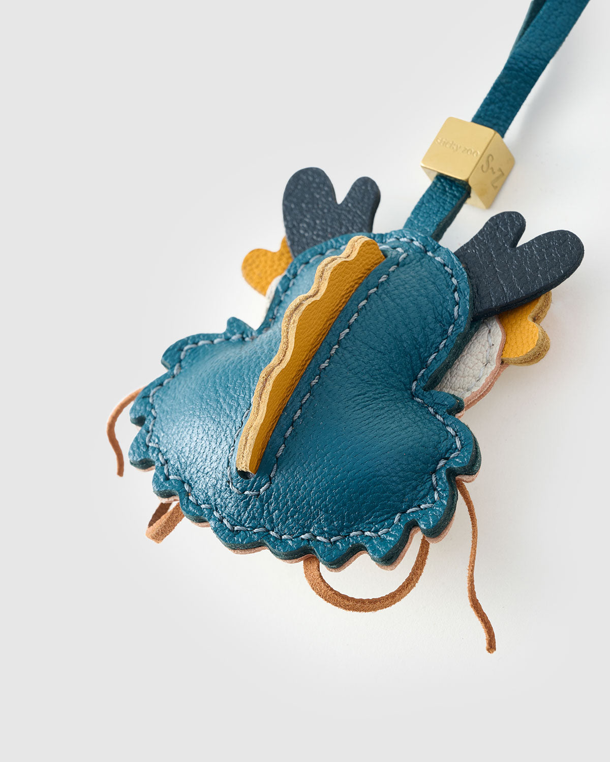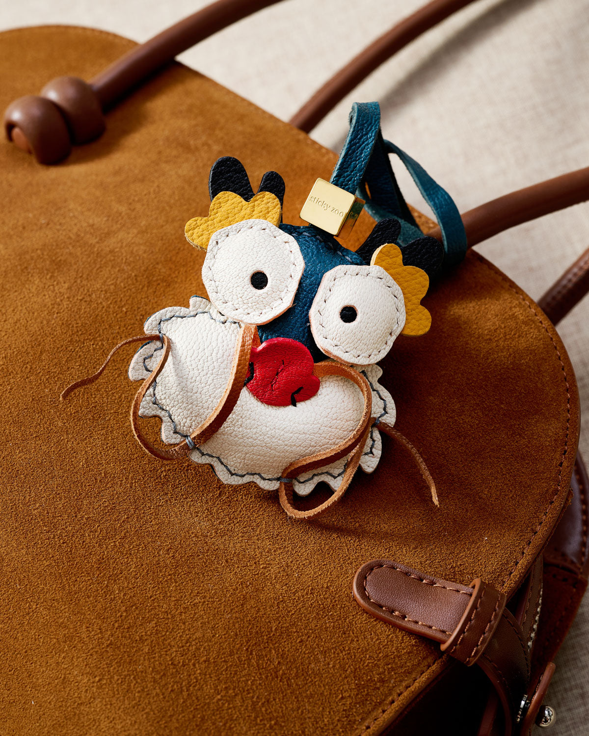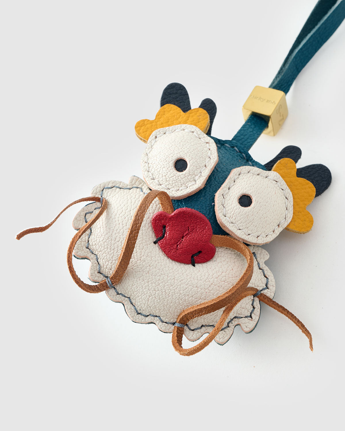 Each charm is individually handmade from layered french alran leather in teal, ivory, yellow, and red tones, stitched and sculpted to capture the energy of a dragon in motion. The exaggerated eyes and expressive textures reflect STICKY ZOO®’s playful craftsmanship, making it a collectible that adds personality to any bag or keychain.