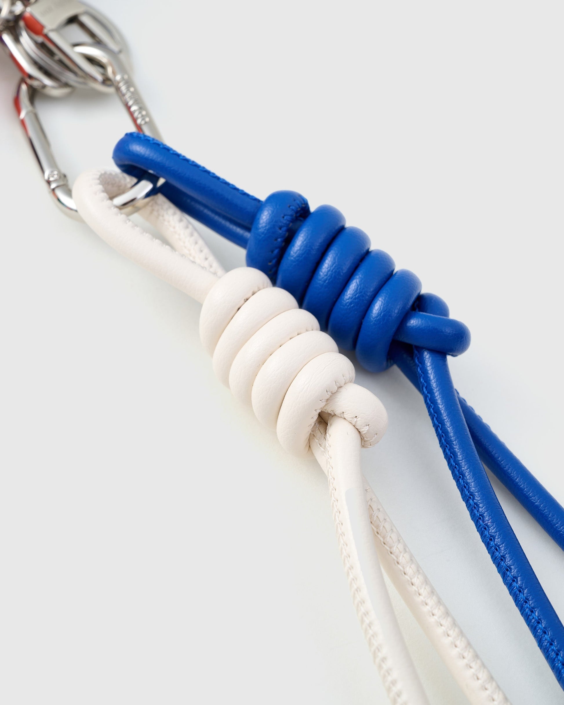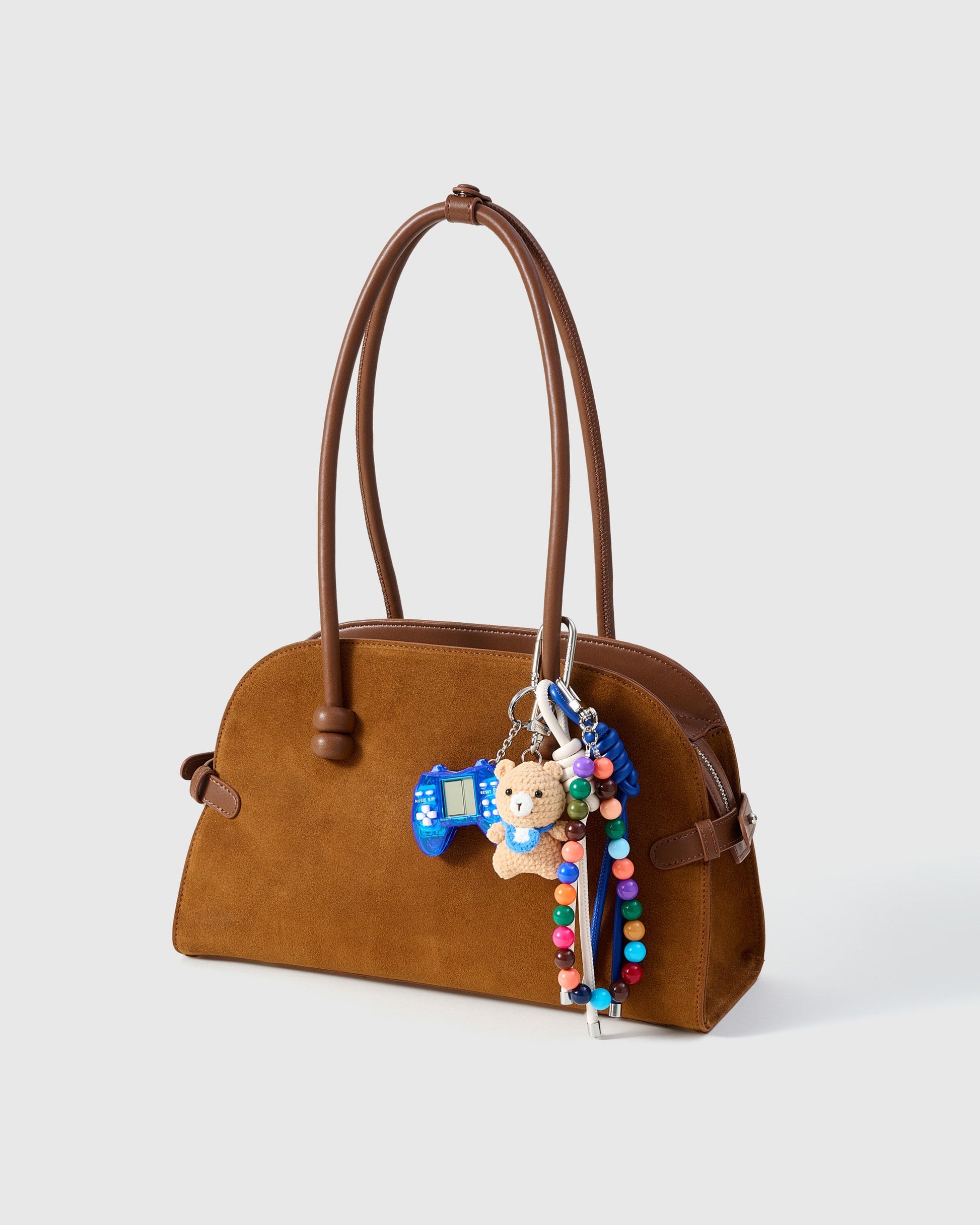 | Materials | Plush bear mascot; translucent blue console mini game; rainbow bead “gumball” loop; French Alran leather tassel cords (cobalt & ivory) |