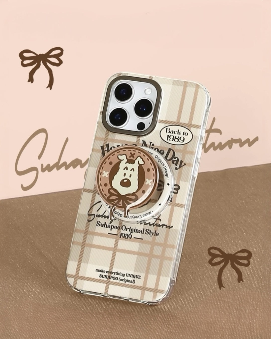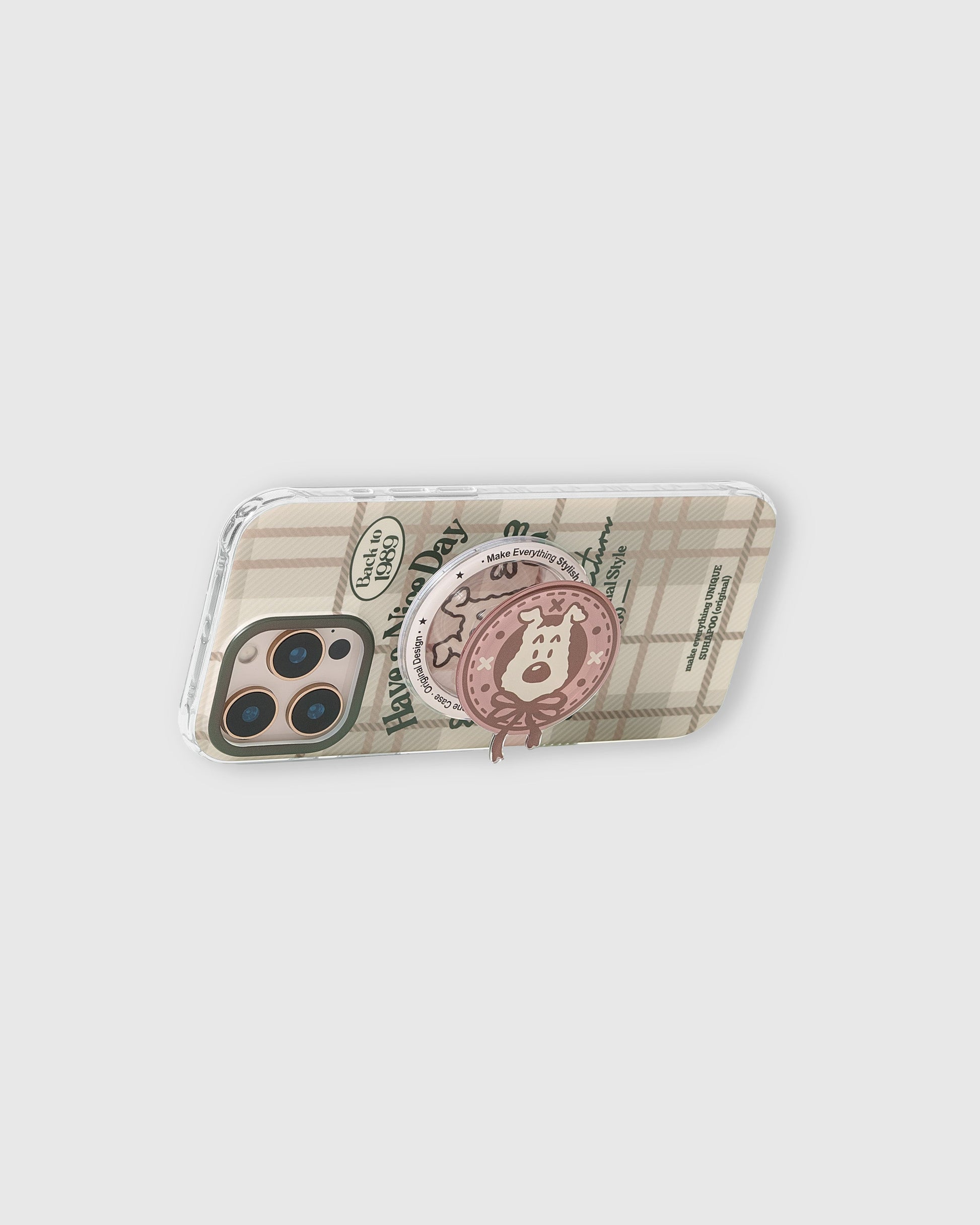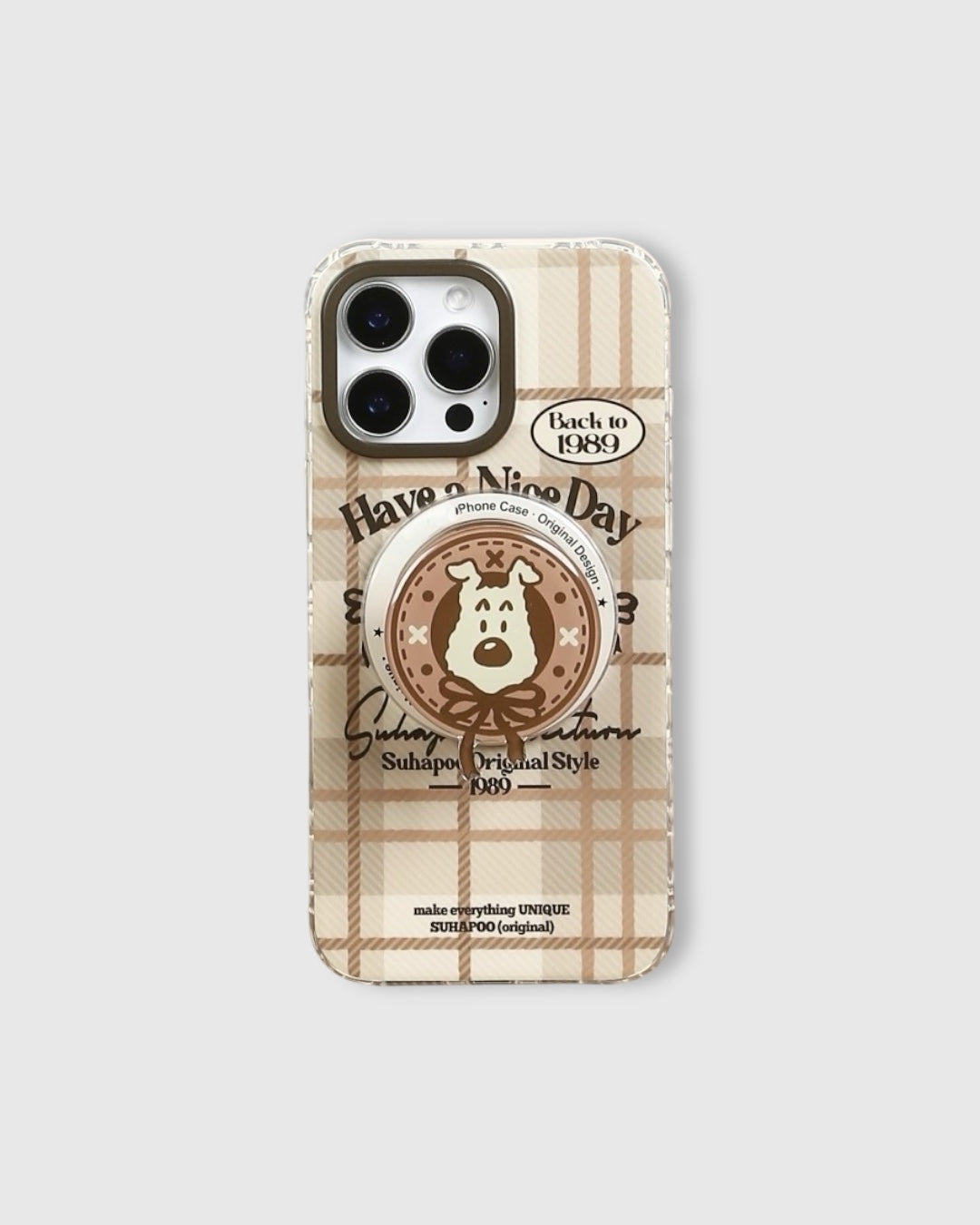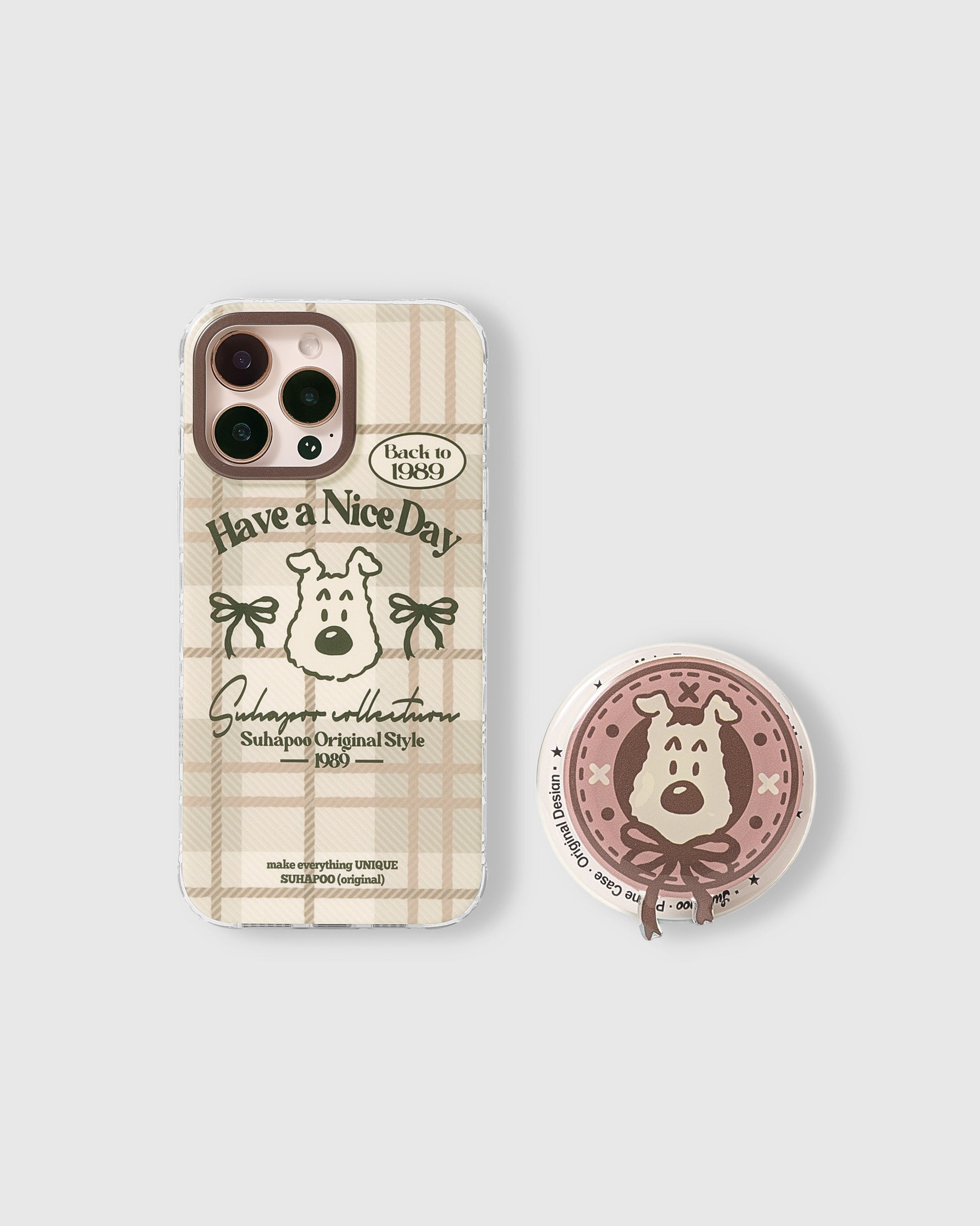 The Have a Nice Day Case is your warm plaid security blanket with ears. Dressed in soft beige tartan and ribbon bows, this pup brings calm, cozy energy to your everyday screen time.