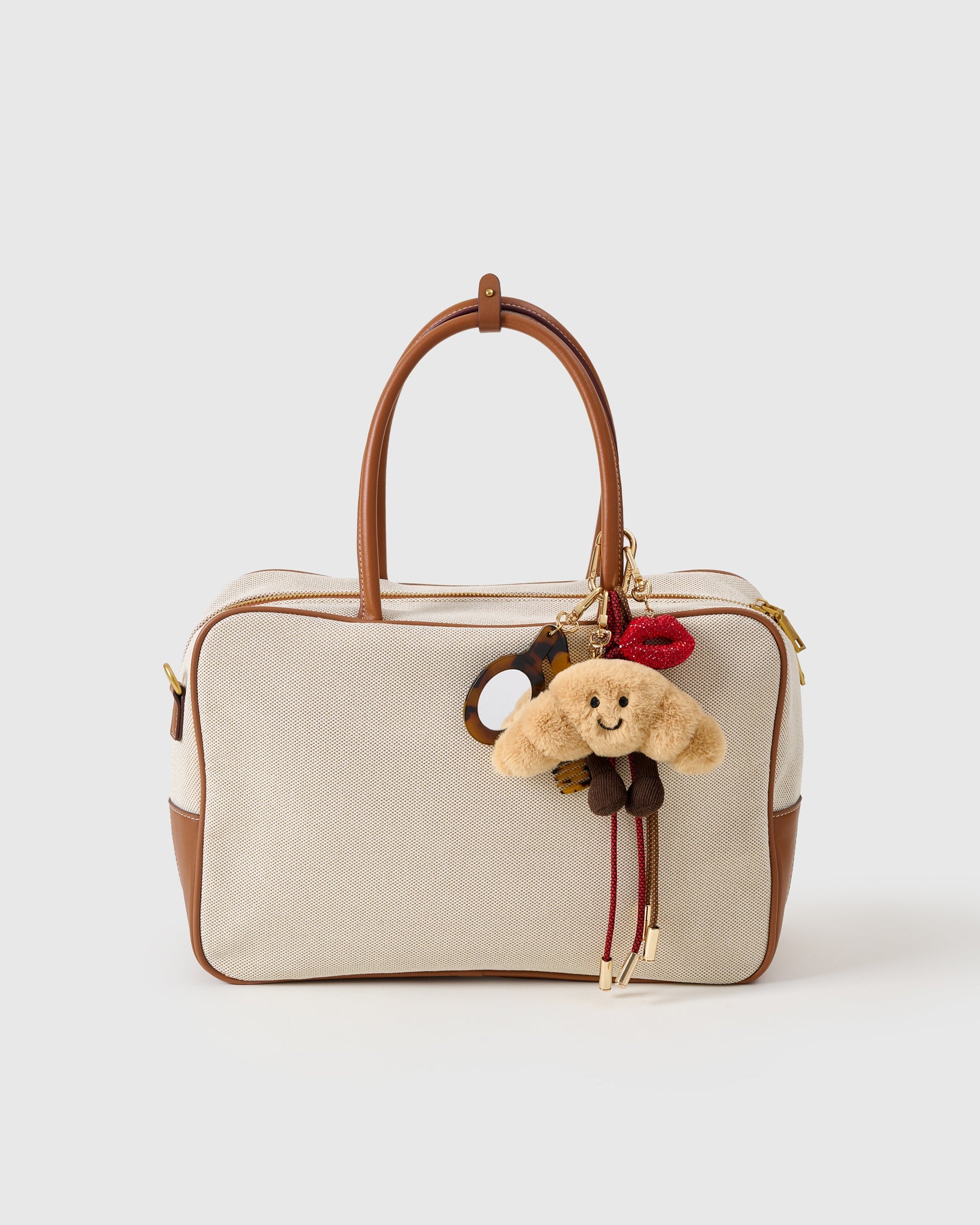 The KISS-ME CROISSANT GIRL STACK CHARM – TORTOISE MIRROR EDITION from Sticky Zoo® blends patisserie-cute character with polished detailing. Hand-assembled with a plush croissant mascot, a crystal lips charm, a tortoise-acrylic mirror comb, and braided cords on gold-tone stainless hardware, it layers effortlessly on handbags, keys, camera straps, and weekender totes.