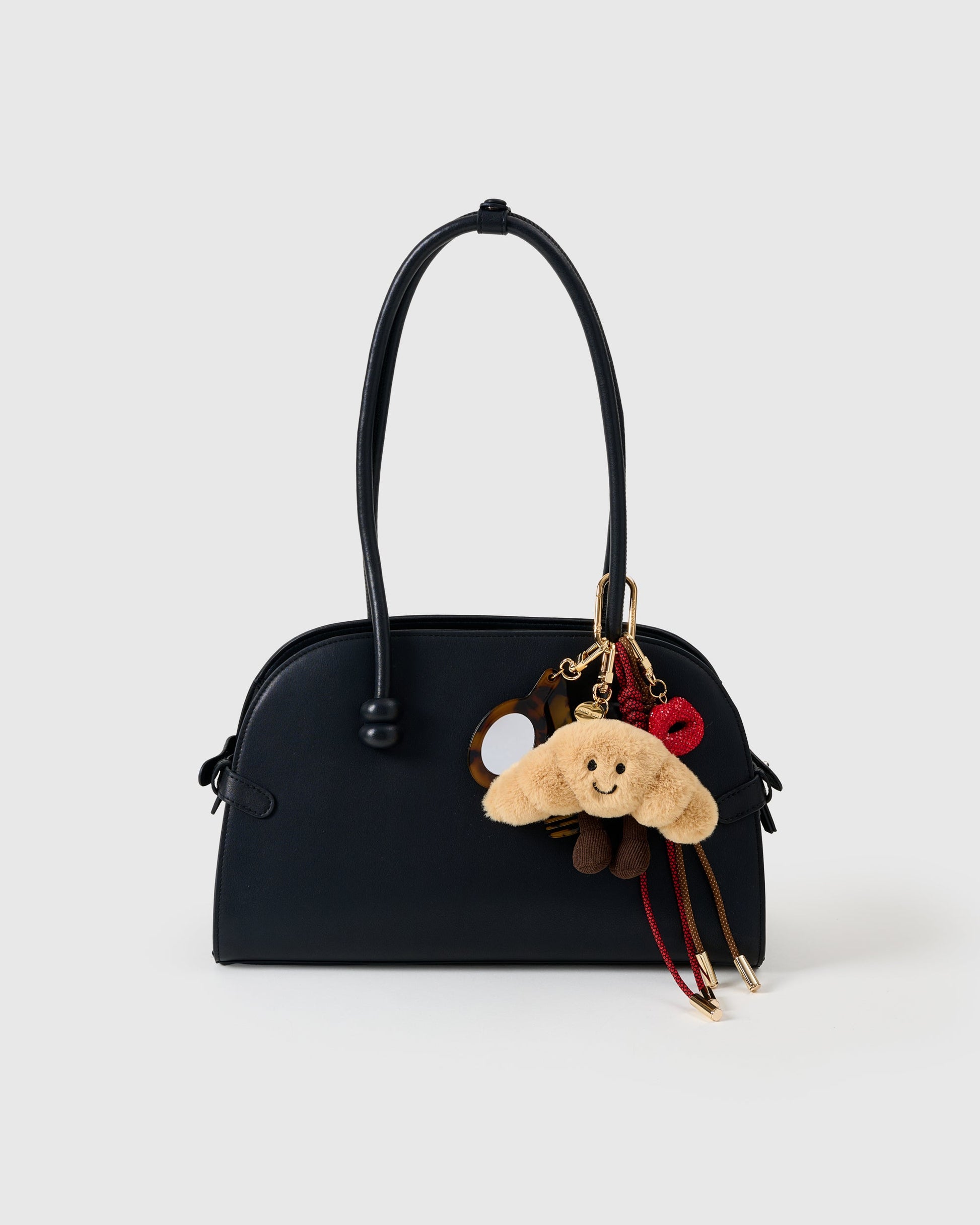 Croissant Girl — buttery-soft plush, bright eyes, and cheeky booties. The crystal lip charm adds a pop of sparkle while the tortoise mirror comb brings chic, useful flair. Rich cocoa and red cords sway for elegant movement and easy stacking.