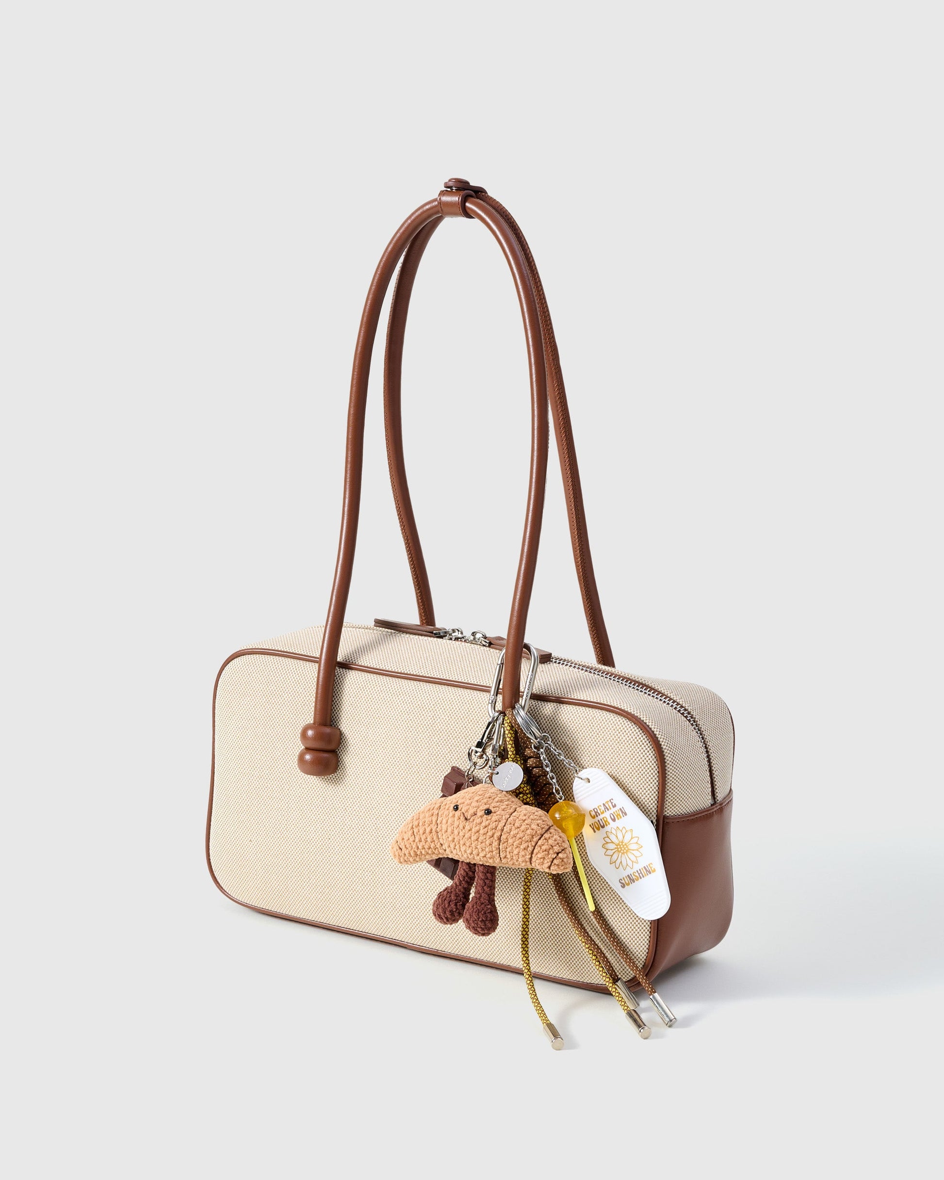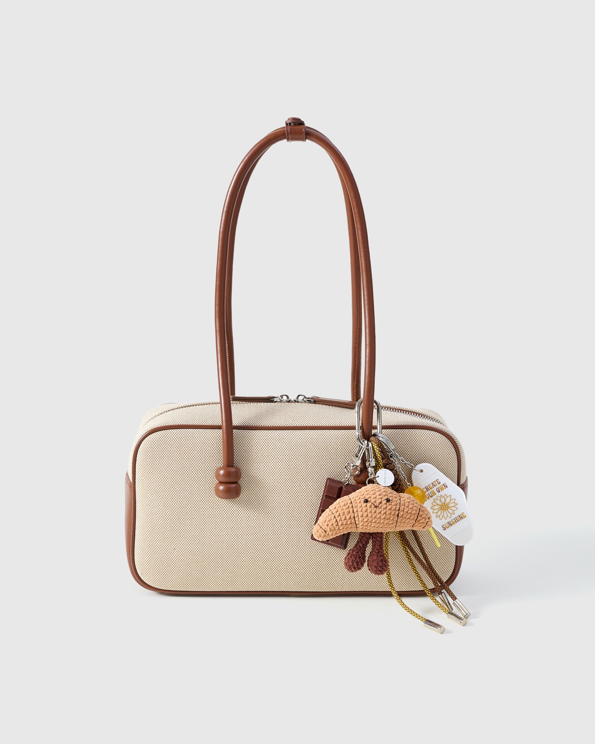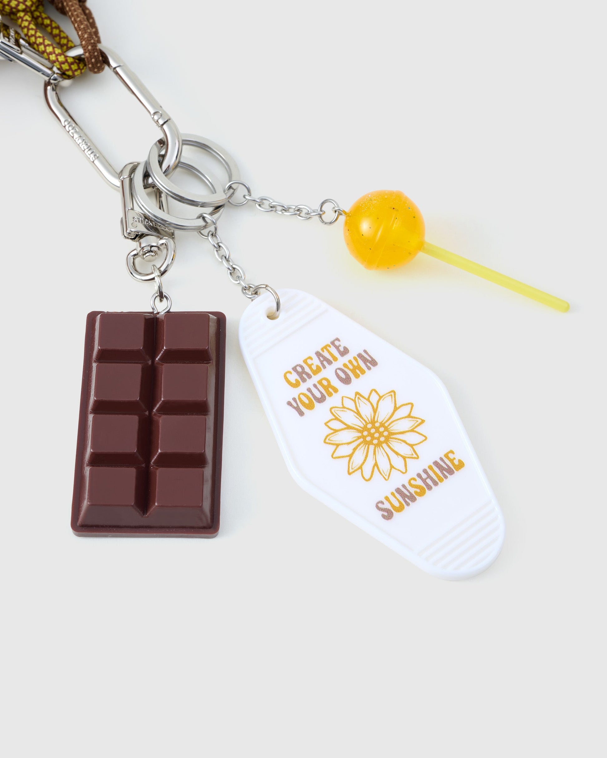 | Materials | Plush croissant mascot; acrylic chocolate-bar charm; “Create Your Own Sunshine” motel tag; honey lollipop charm; rope tassels (mustard & cocoa) |