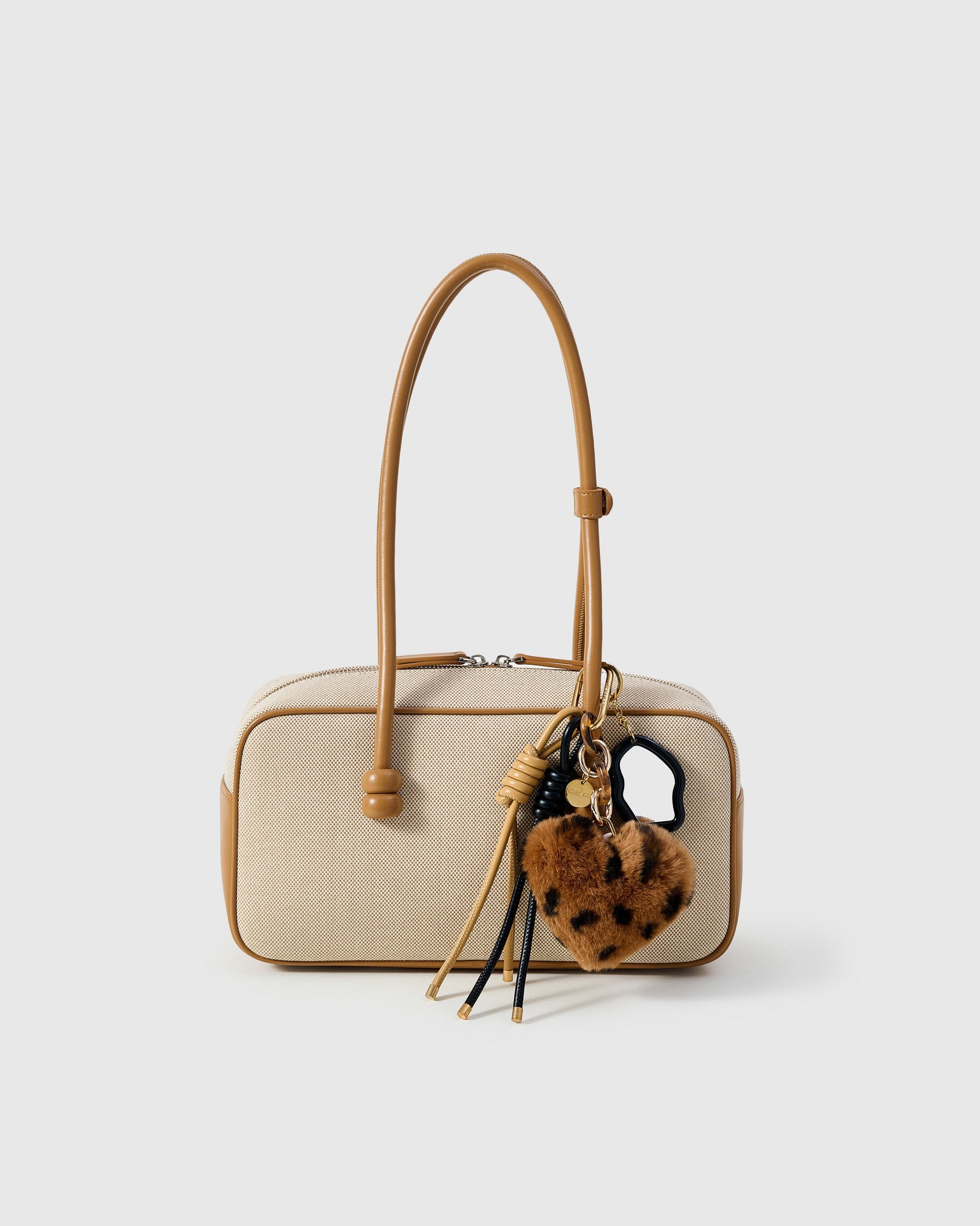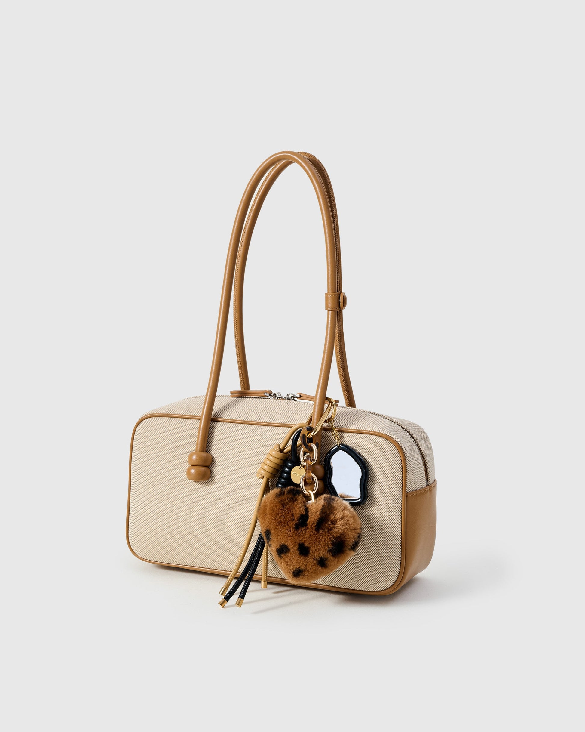 Wild at heart. A plush leopard heart, a sculptural wavy mirror, and tan–black tassels bring chic sparkle and instant compliments to every carry.