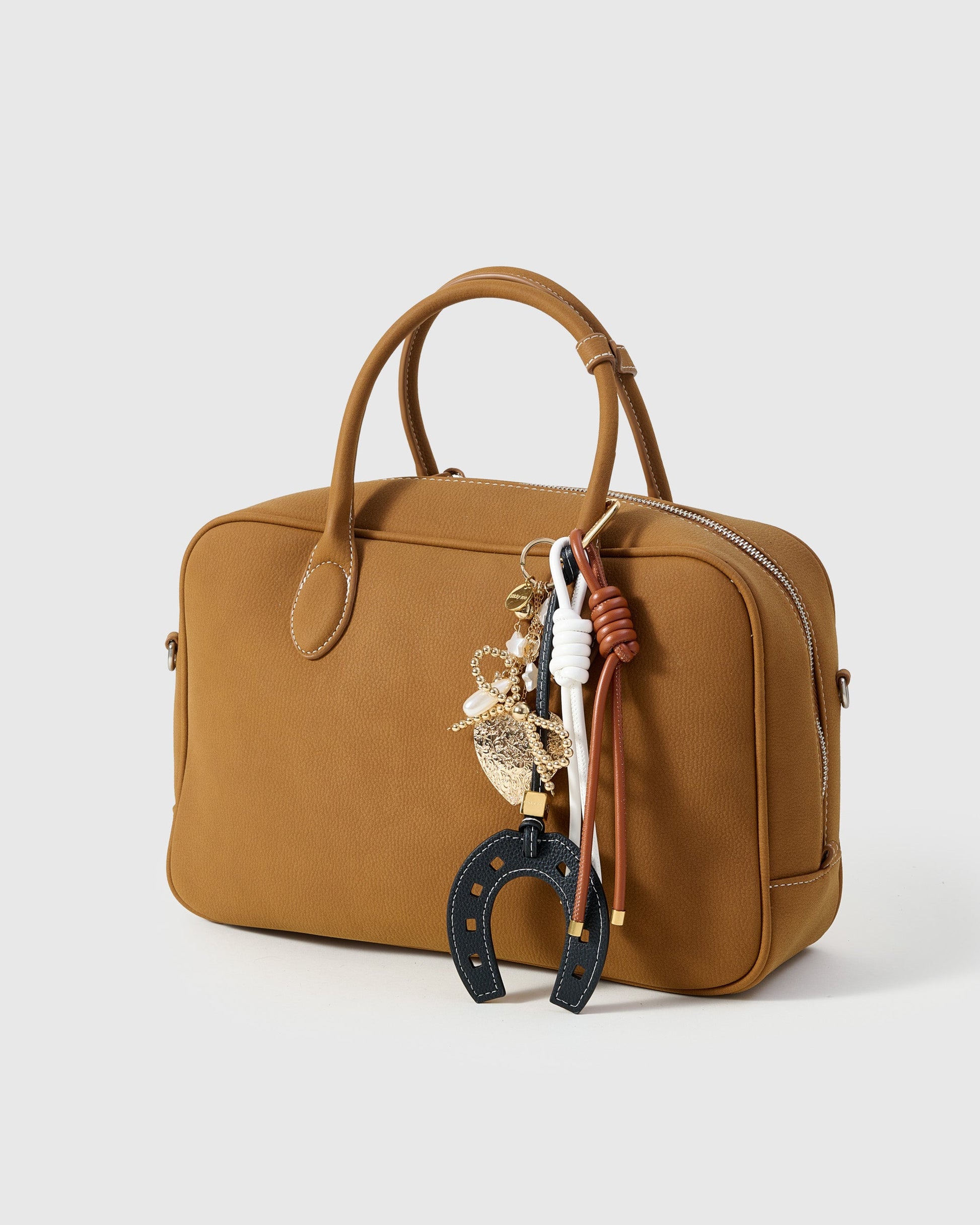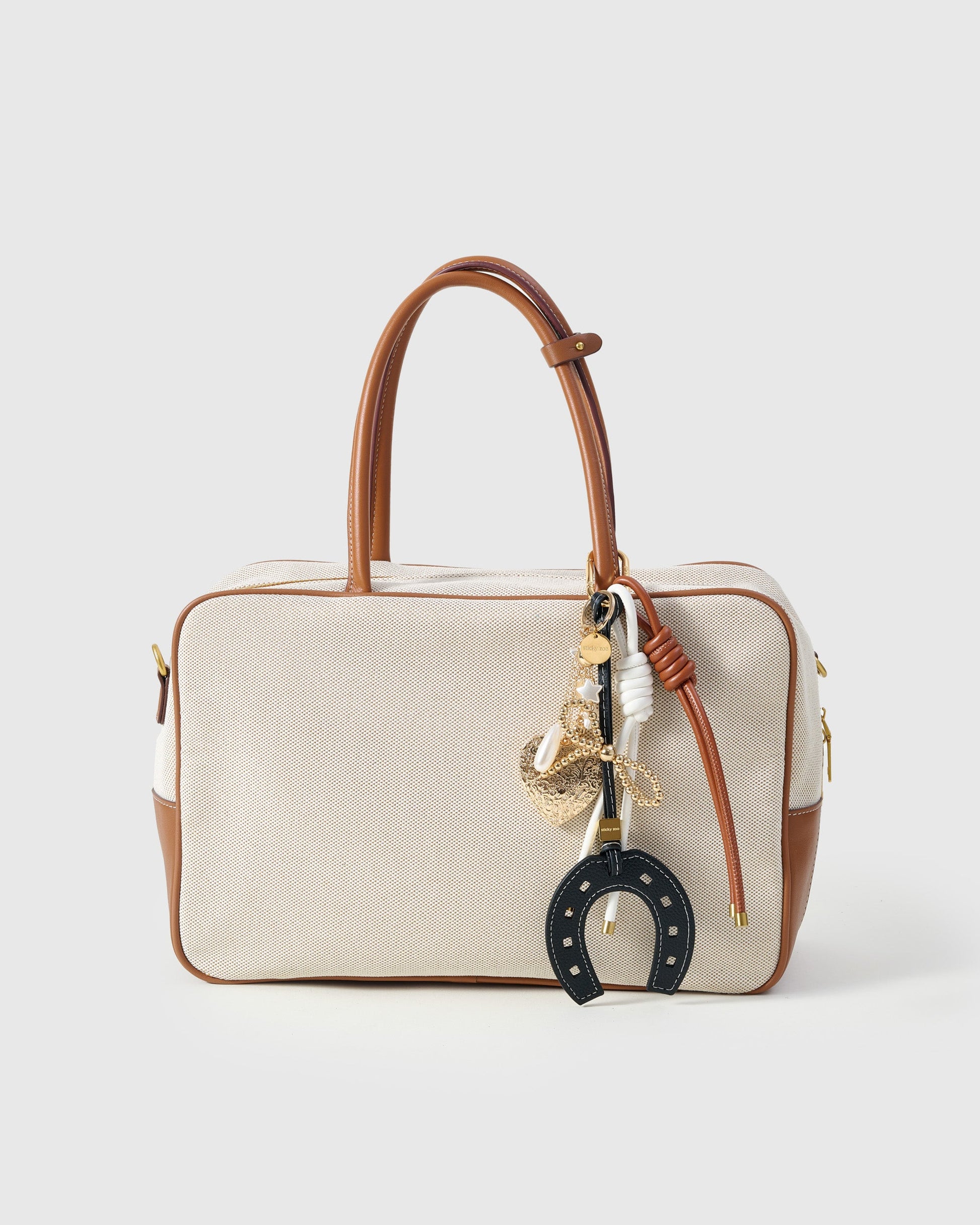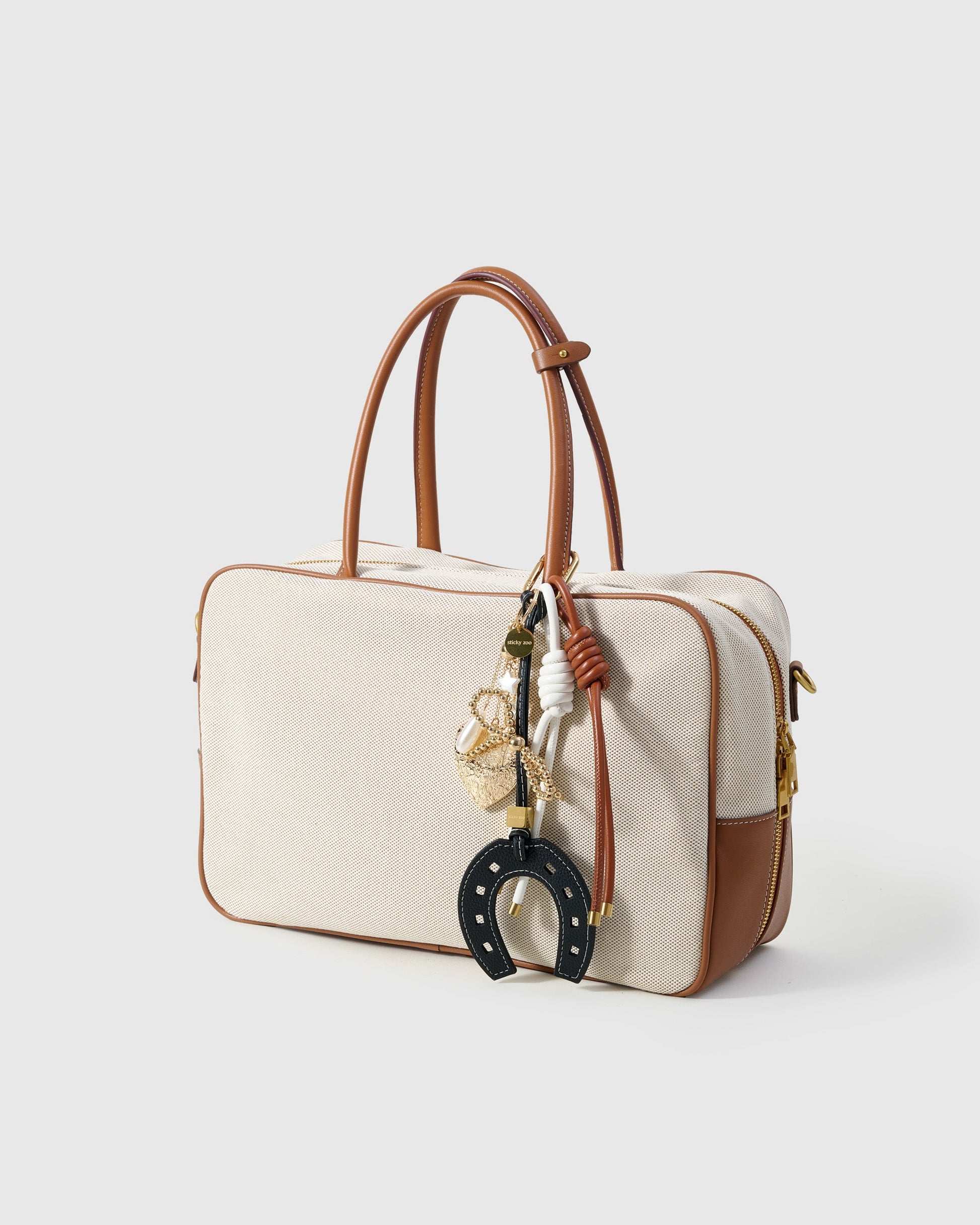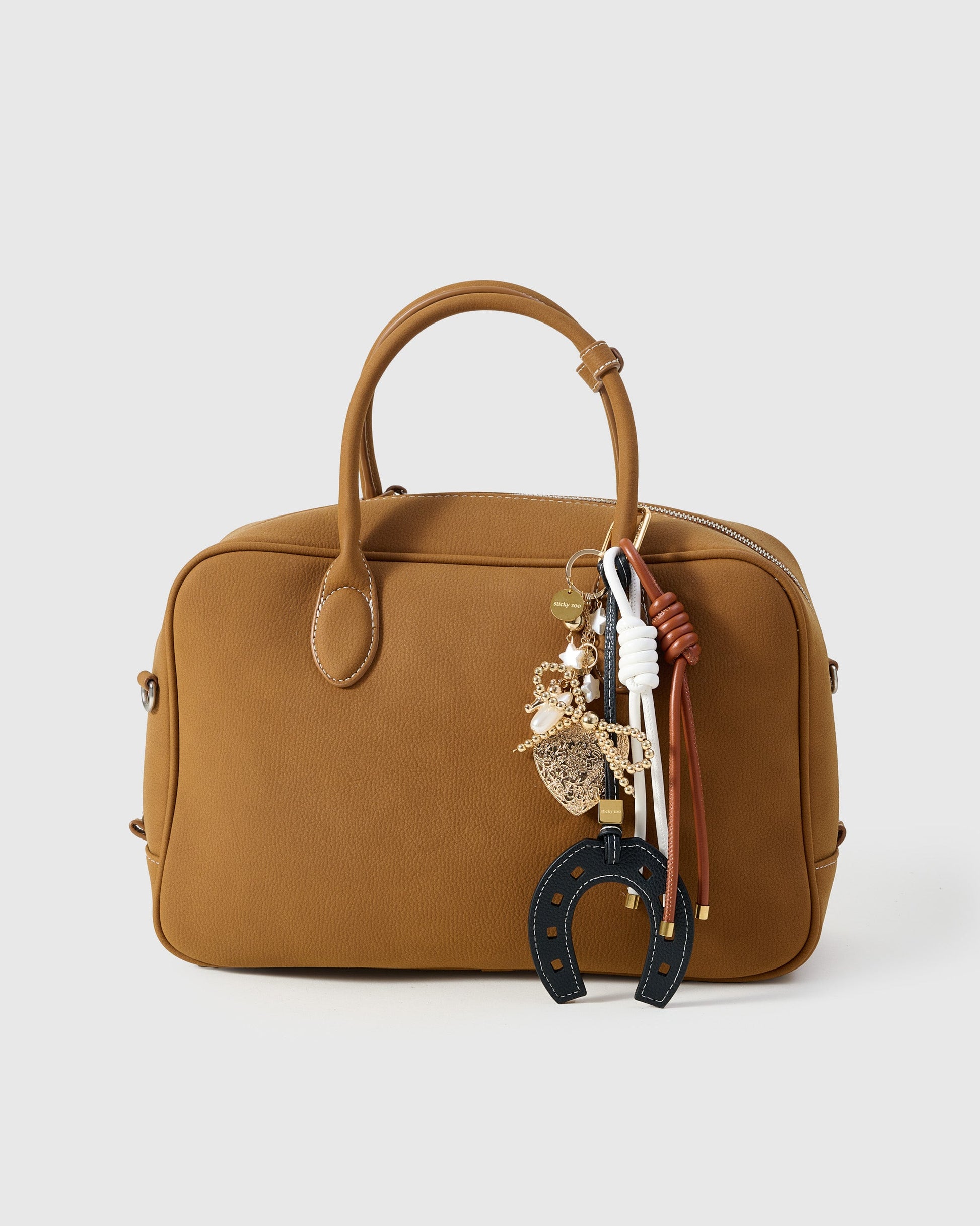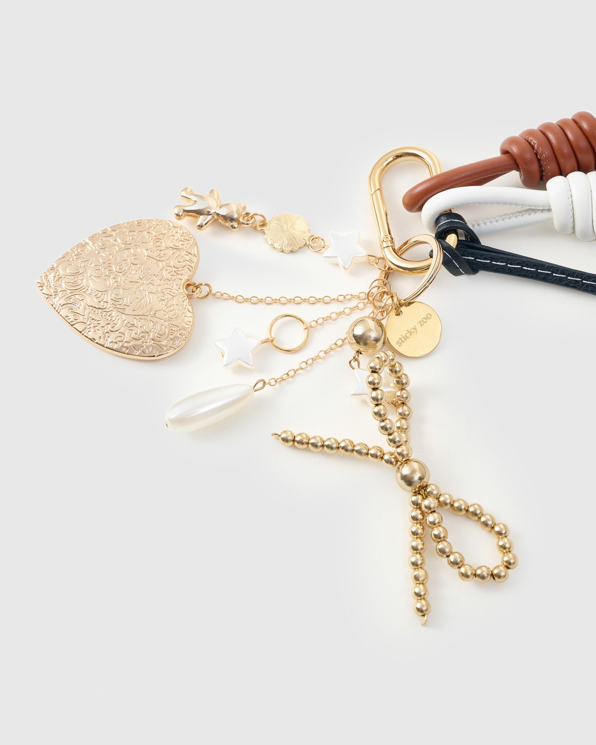 The LUCKY HORSESHOE BOW STACK CHARM from Sticky Zoo® is your chic talisman. Hand-assembled with a French Alran leather horseshoe (pebble grain, contrast saddle-stitch), a gold beaded bow, and a cascade of heart, star, and pearl accents, it layers on handbags, keys, camera straps, and weekender totes with ritual-like ease—on a Polished 18K gold clip engraved with Sticky Zoo® logo.