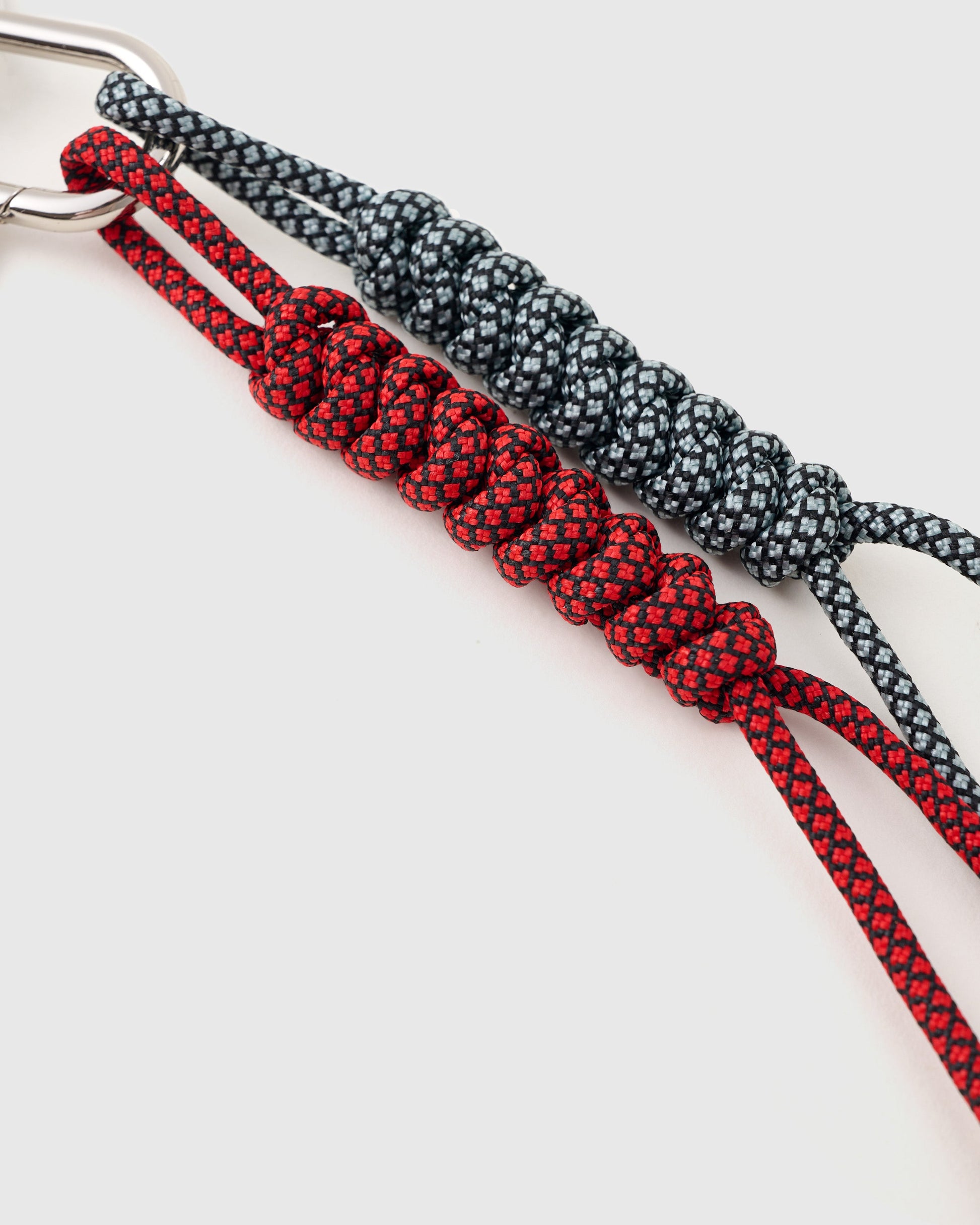 Wrapped in red and black hand-braided paracord cords with metallic ends, it brings energy and edge to any bag or belt loop.