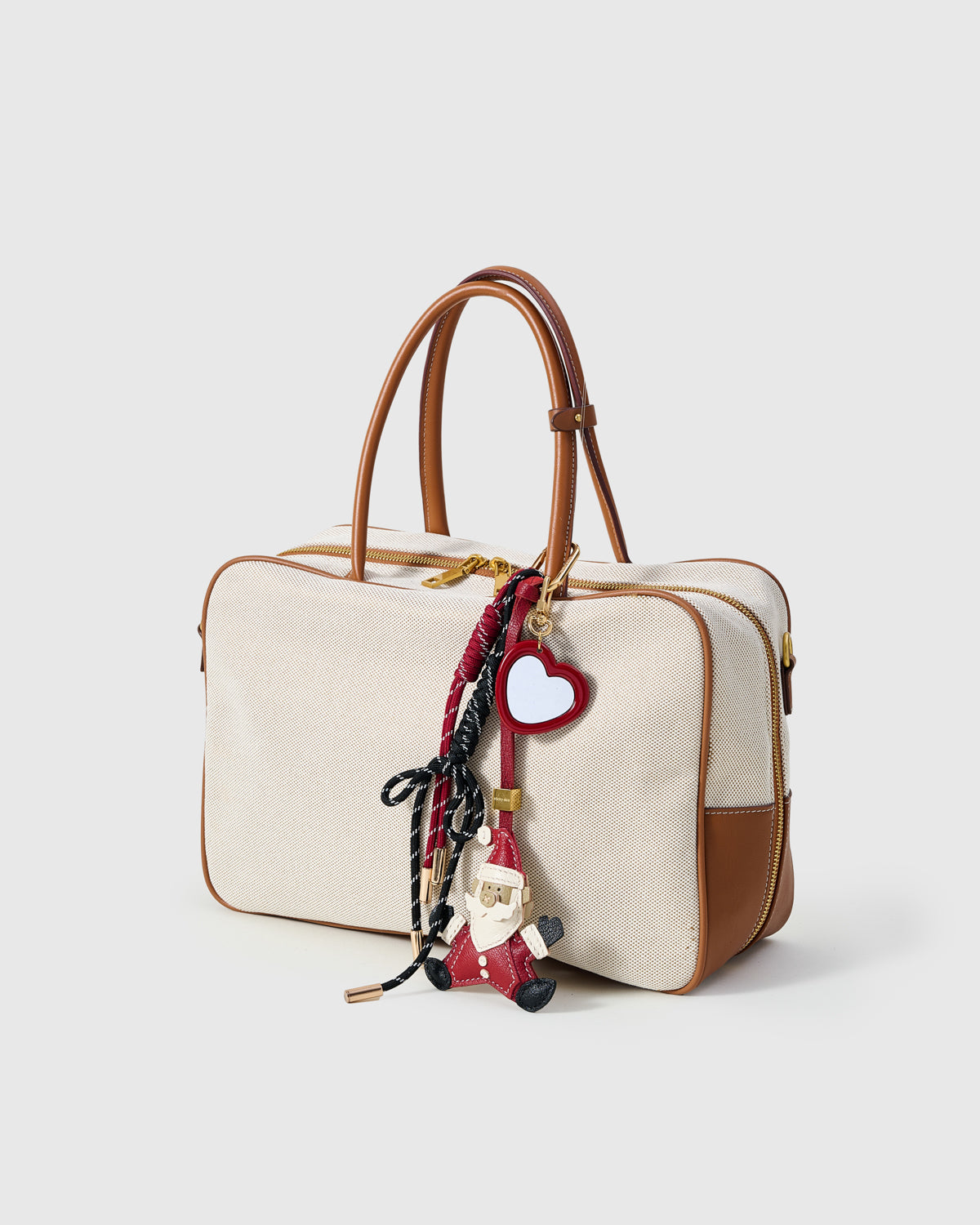 - Materials: Vegan-leather Santa charm, red heart mirror, holiday cords