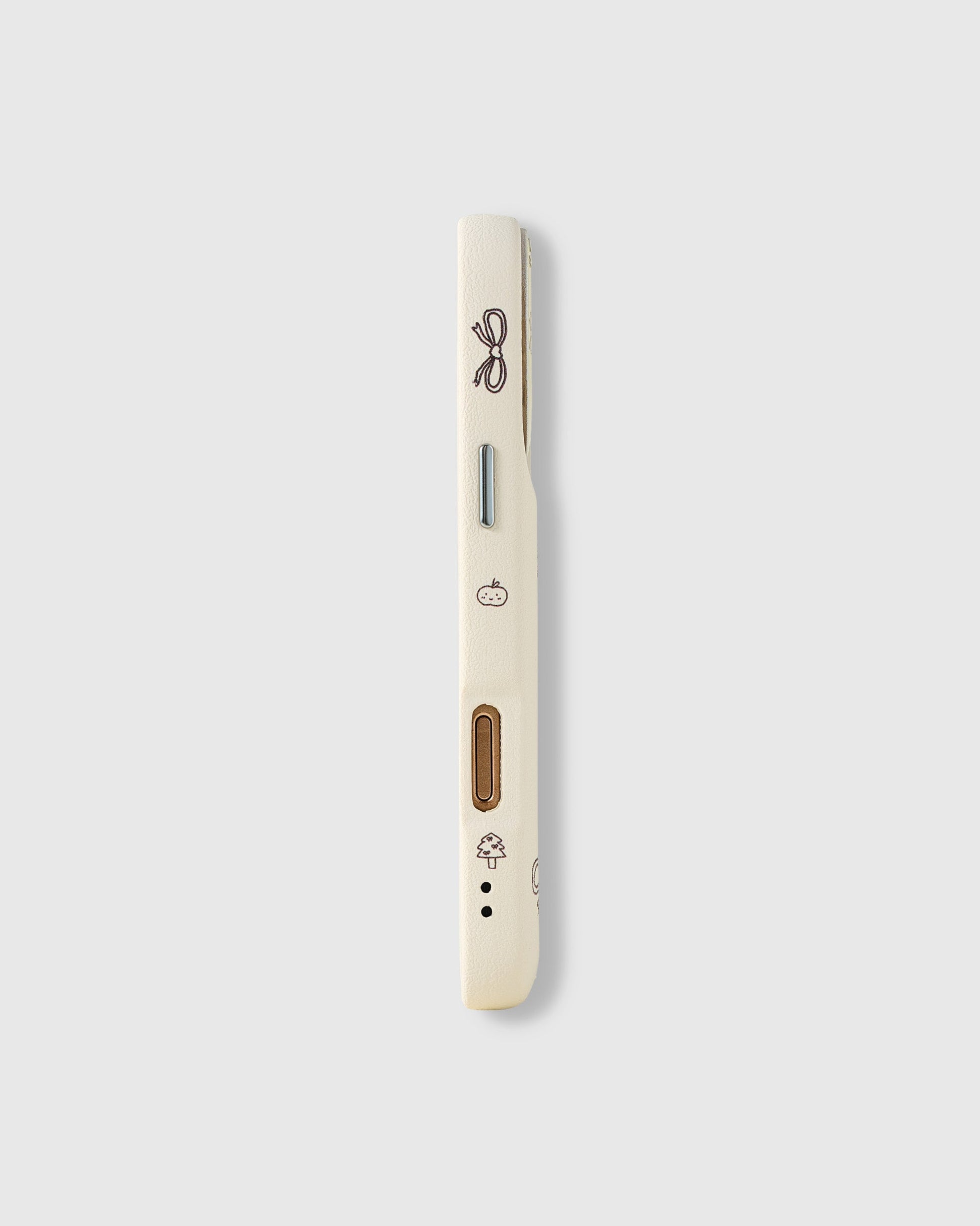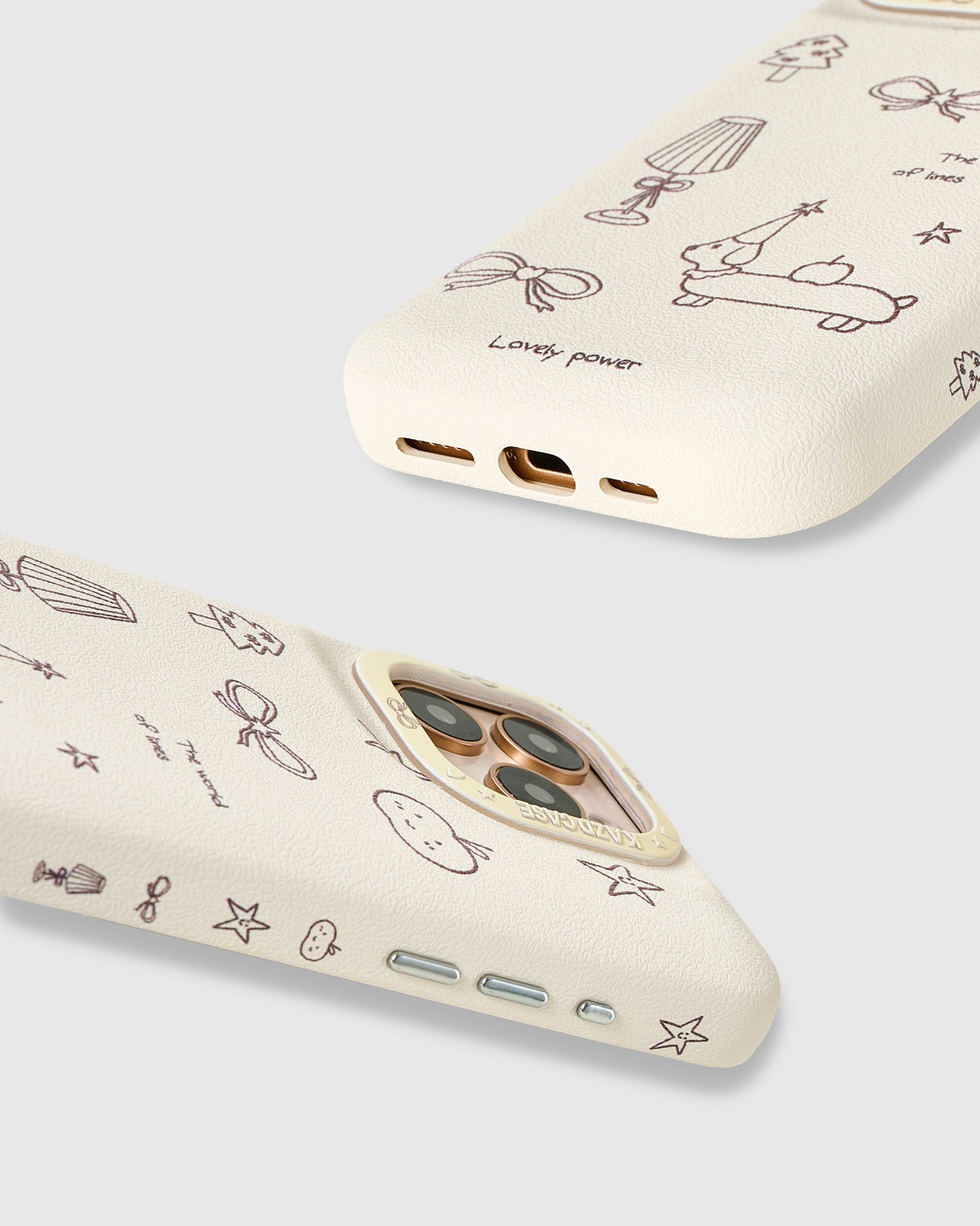 Minimalist doodle illustrations of stars, ribbons, and a dachshund wearing a party hat with the phrases “The world of lines” and “Lovely power” add personality to the cream-toned case. It’s an understated yet whimsical design, perfect for those who love dogs and hand-drawn charm.