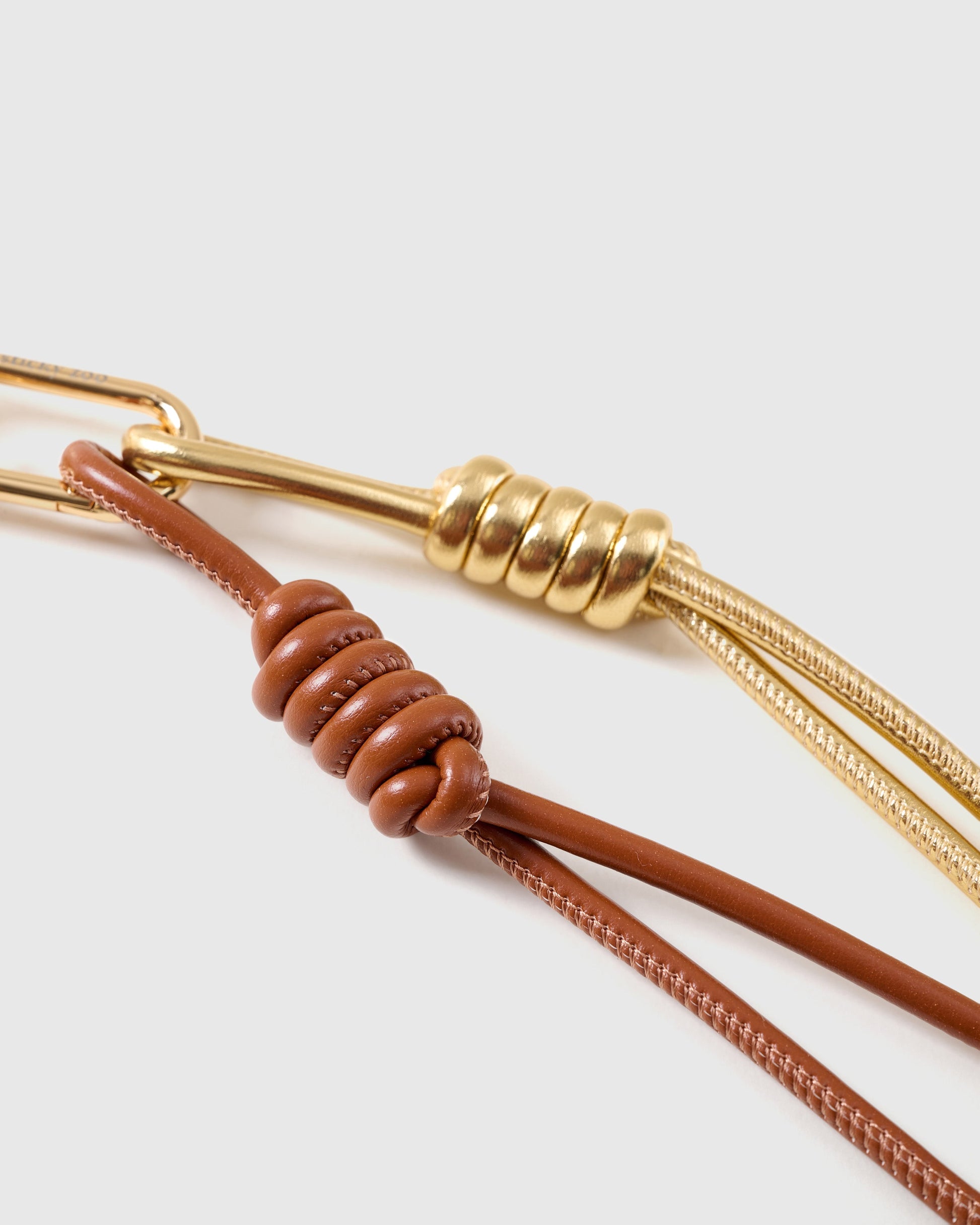 - Includes 18K gold-plated clasp + leather-wrapped tassels