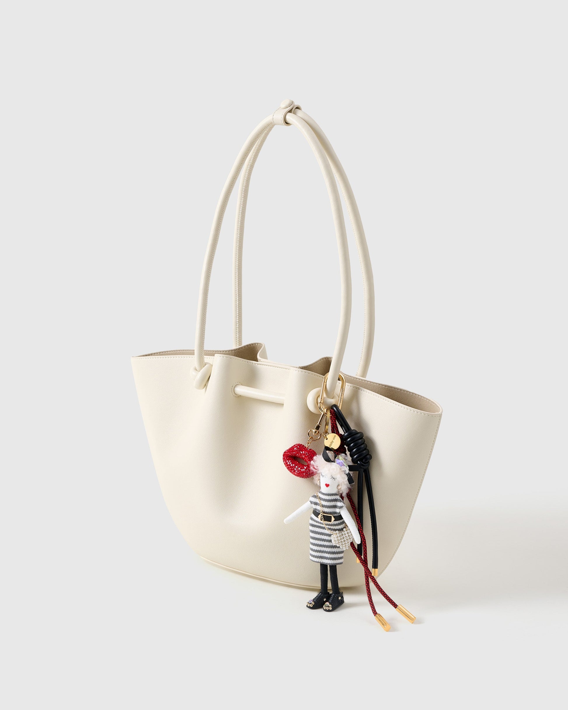 - Materials: Handmade fabric doll, crystal lip charm, pearl bag, leather cords, gold hardware