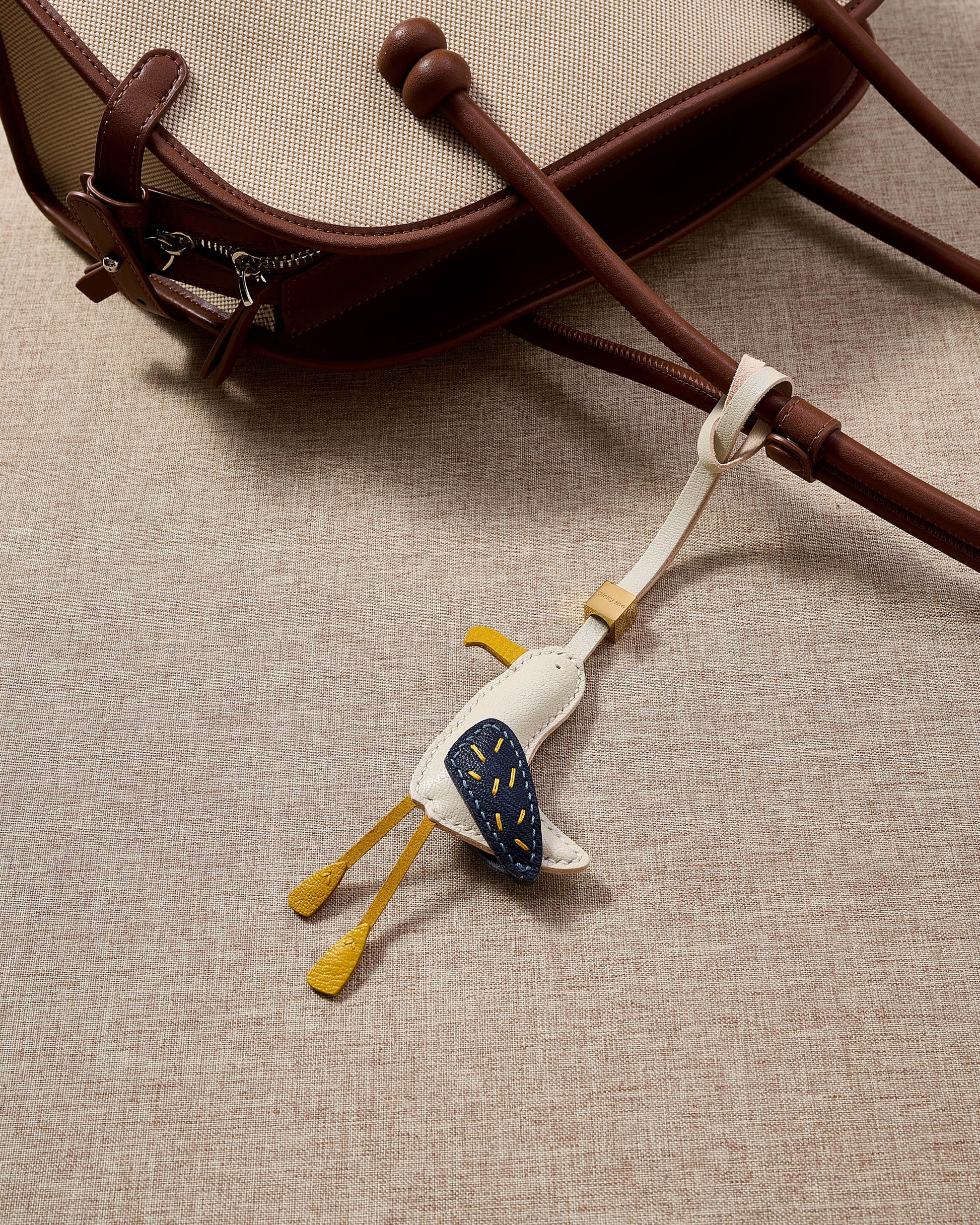The SEAGULL BIRD CHARM from STICKY ZOO® is handmade from premium French Alran leather, balancing creamy ivory tones with navy and mustard accents. Designed to switch easily from bag charm to keychain, this small character carries all the charm of a summer horizon in motion.