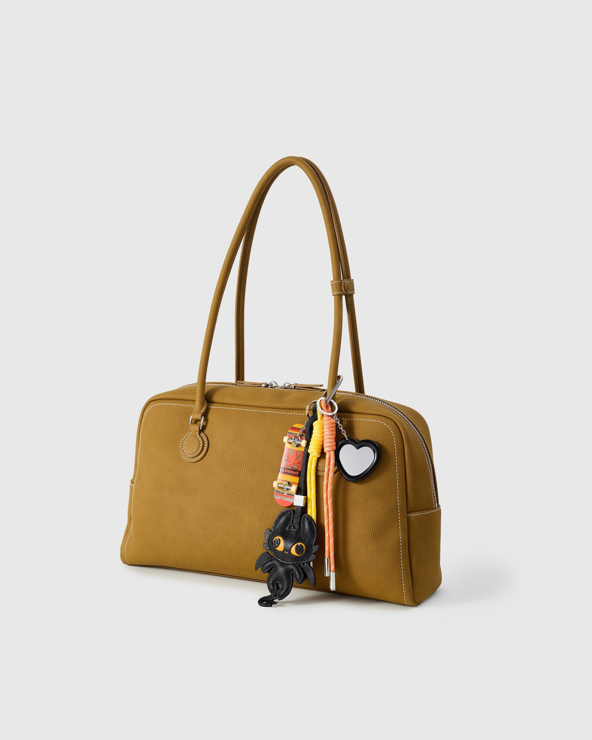 Skater Dragon Stack Charm is spirited, collectible, and a little mischievous. Crafted in premium French Alran sheepskin leather, the wide-eyed dragon is layered and padded for a soft, tactile profile. The stack adds a mini skateboard charm for attitude, a black heart mirror for quick touch-ups, and paracord tassels in sunrise yellow and peach for movement and pop.