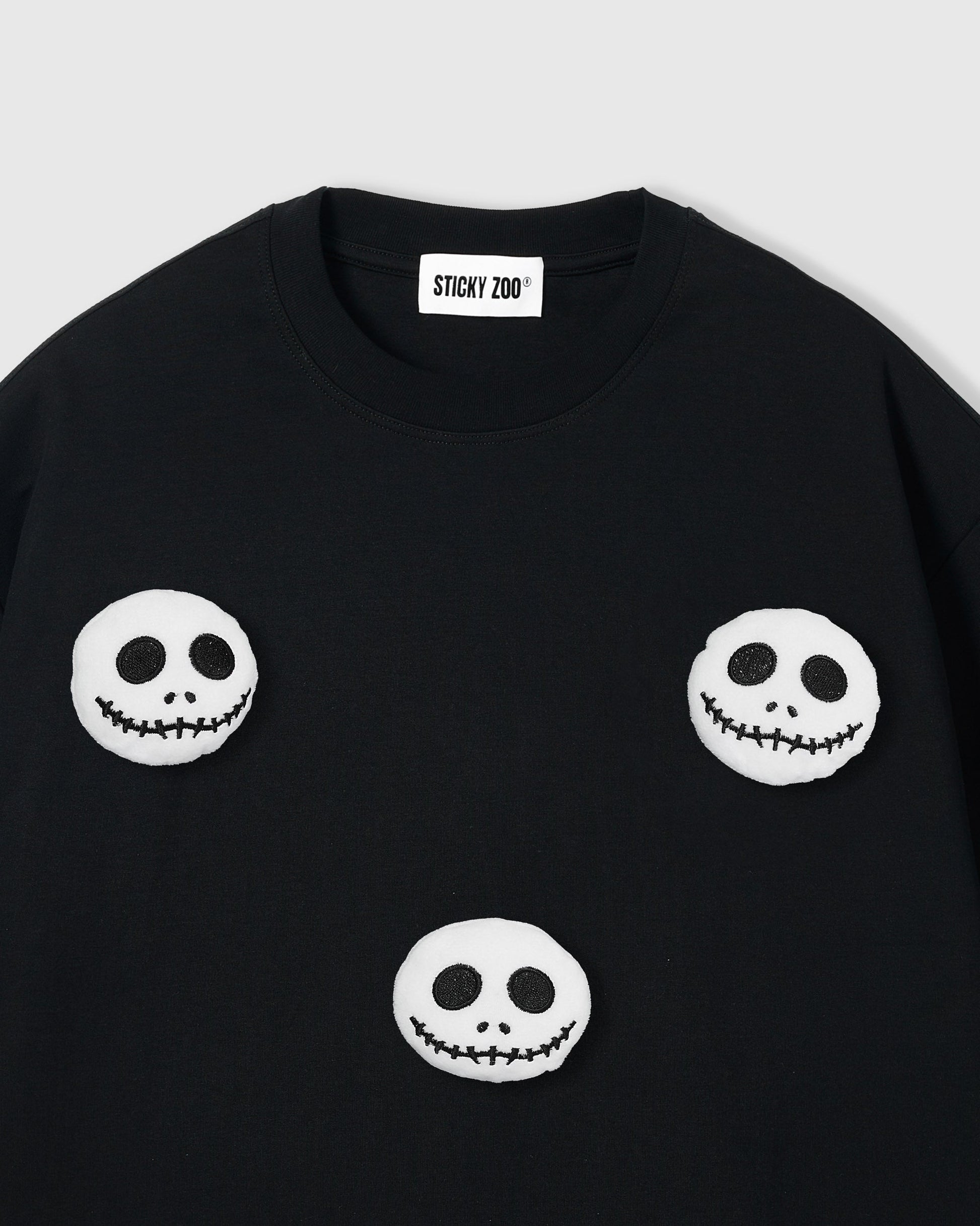 - Colors: Black tee with white skull appliqués