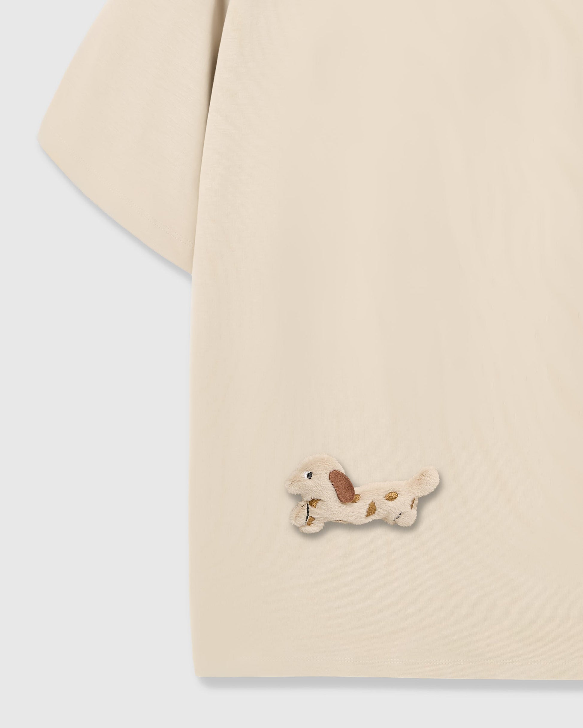 SPOTTY DASH DACHSHUND T-SHIRT brings cozy energy with a dose of puppy love. Designed with hand-stitched plush dachshunds in creamy fur and spotty patterns, this shirt is more than wearable—it’s your daily serotonin hit. Whether you dress it up or down, the soft drape and structured silhouette keep your look elevated.