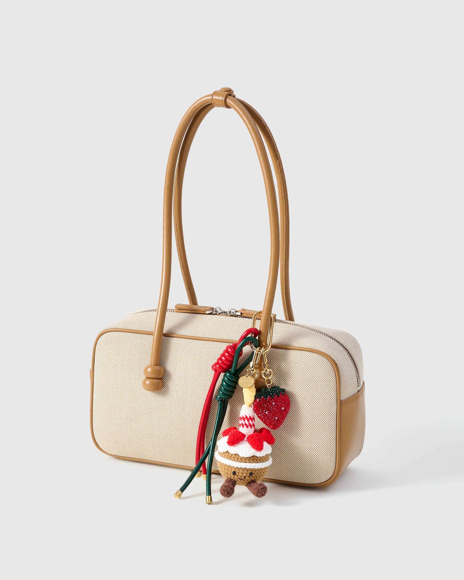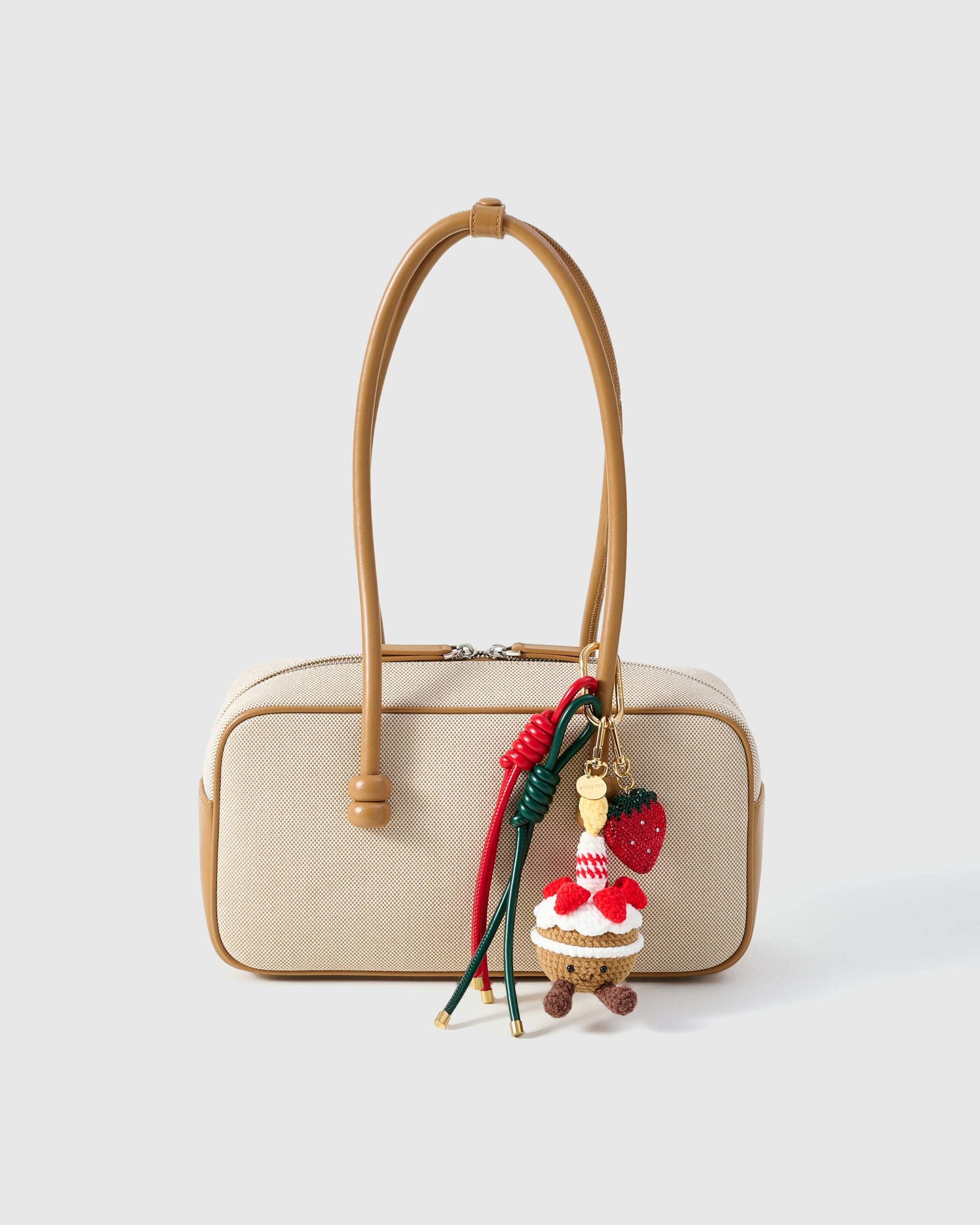 Strawberry Cupcake — whipped-cream trims, berry pops, and a smile that brightens every carry. The faceted strawberry catches light like jewelry, while festive tassels add graceful movement.
