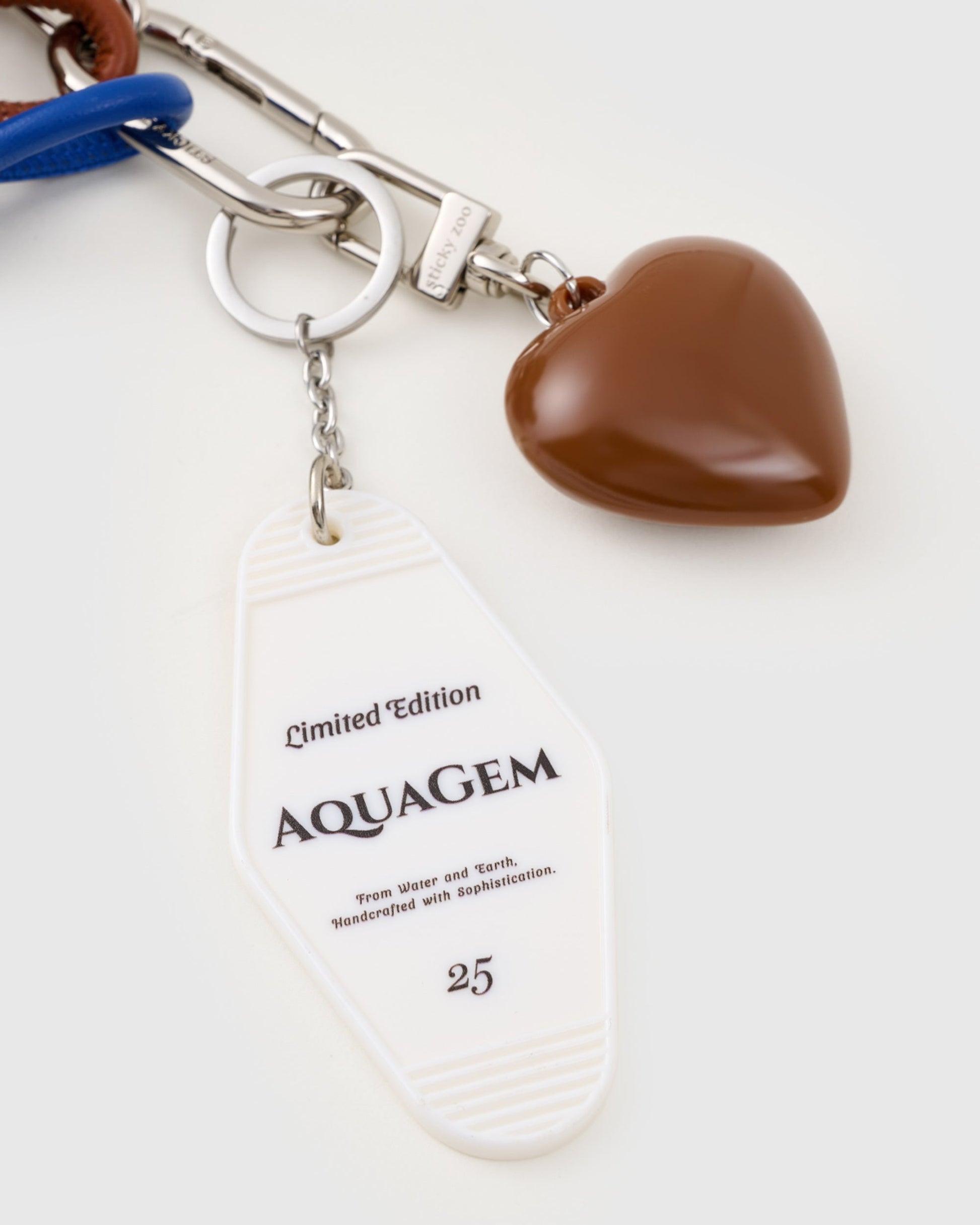 A heart-on-sleeve moment, clipped. Teddy Manchi’s blue overalls, caramel heart, and Aquagem tag bring polished sweetness and instant compliments to any carry.