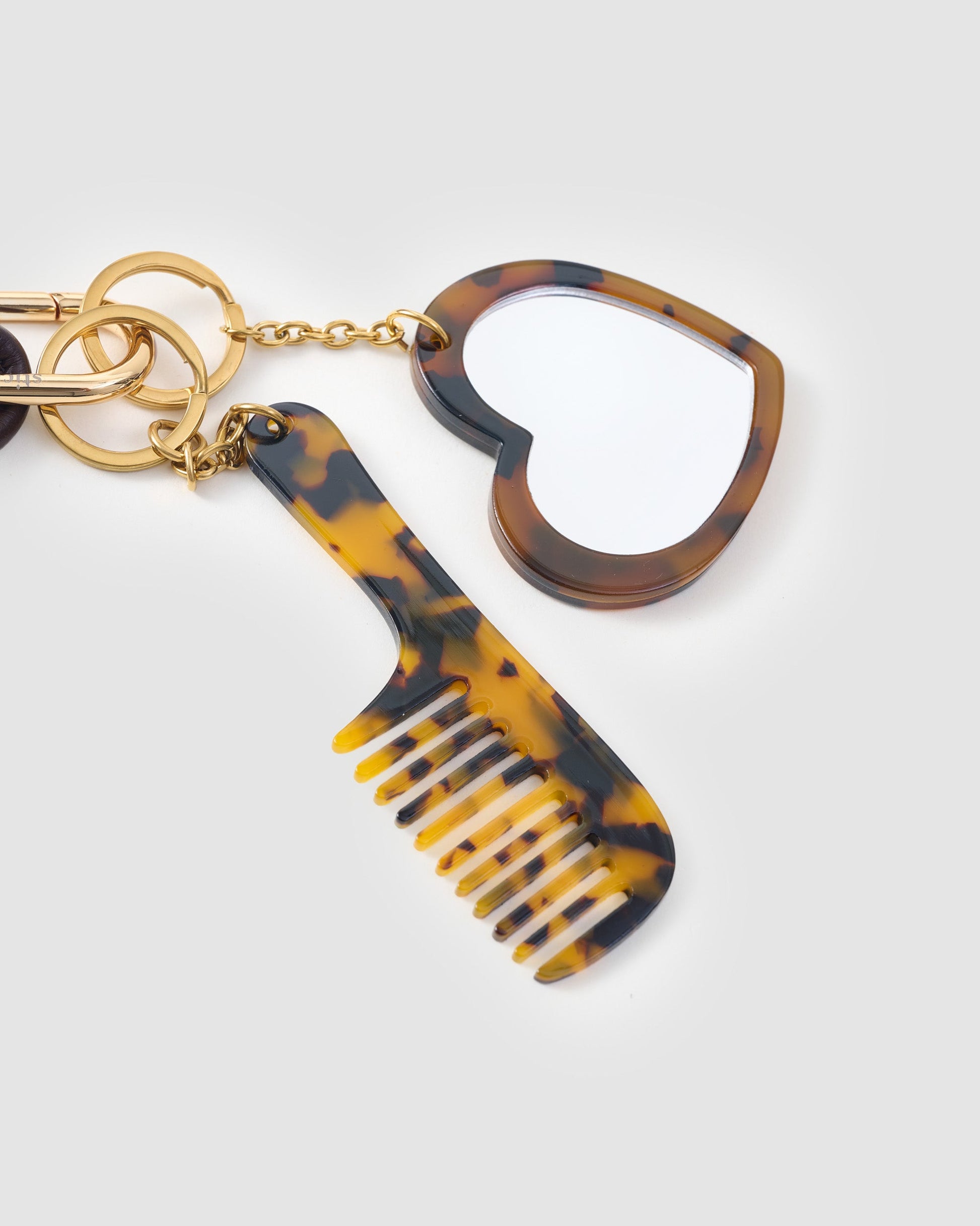 Teddy + Tortoise — honey-soft fluff meets glossy tortoise. The heart mirror catches the light (and helps with quick touch-ups) while the tortoise comb brings chic, useful flair. Neutral cords add graceful movement for easy stacking and all-day wear.